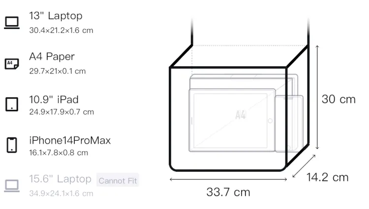 Большая сумка: Длина 33,7 см, Ширина 14,22 см, Высота 29,97 см; Маленькая сумка: Длина (длина тела) 23,06 см, Длина тела 15,85 см