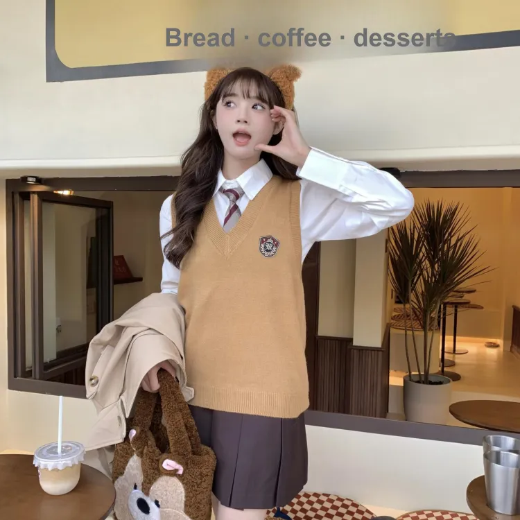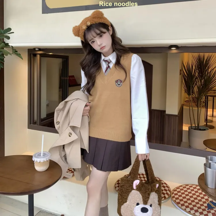 Цвет:Серый жилет с набором из 4 штук (Серый значок на жилете + белая рубашка с длинным рукавом и обхватом талии + синяя и черная клетчатая плиссированная юбка + красный и зеленый галстук)