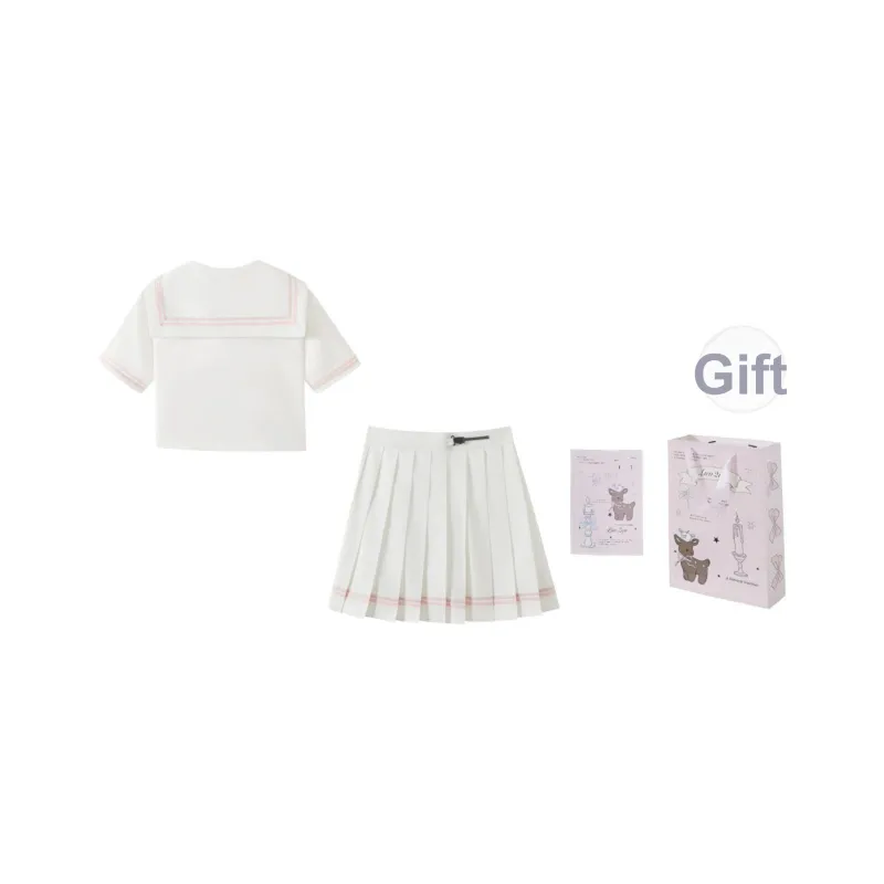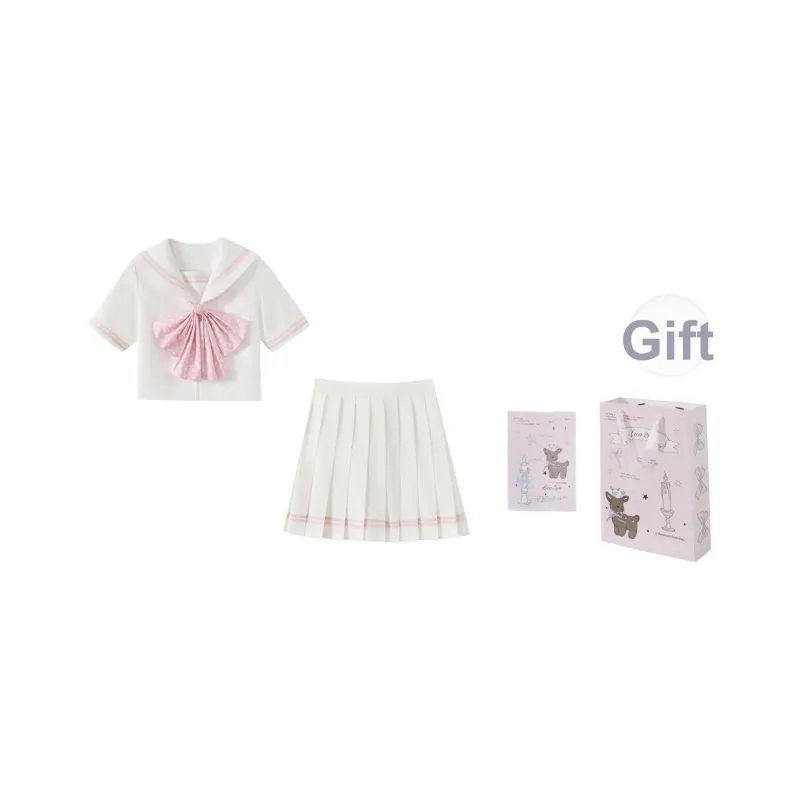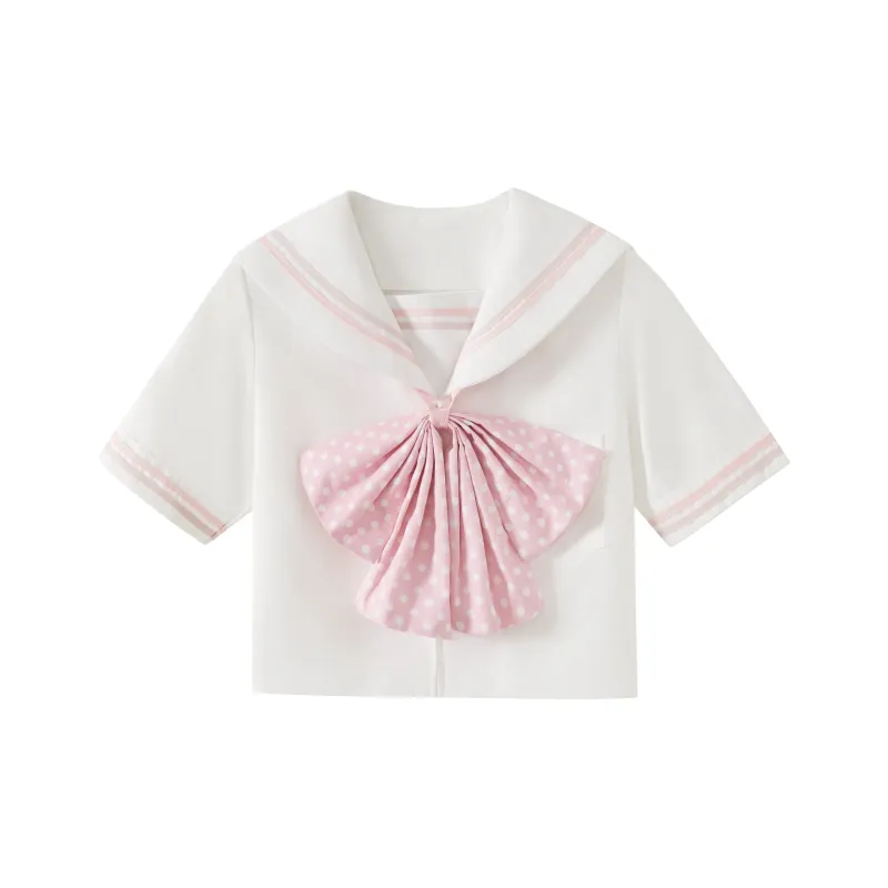 Белый Матроска Розовый Комплект из трех предметов (Белый Матроска Розовый Топ + Юбка с оборками + Розовый Топ с узором в горошек) с бесплатной подарочной картой и бумажной упаковкой