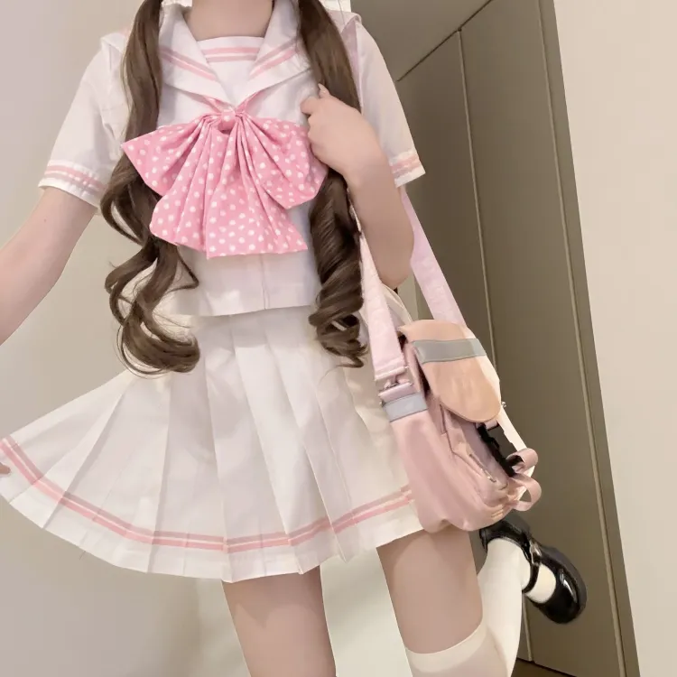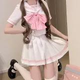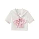 Белый, розовый матрос, комплект из 4 предметов (белый розовый топ + юбка с оборками + розовые галстуки-бабочки в горошек + розовый кардиган) с бесплатной бумажной картой и пакетом