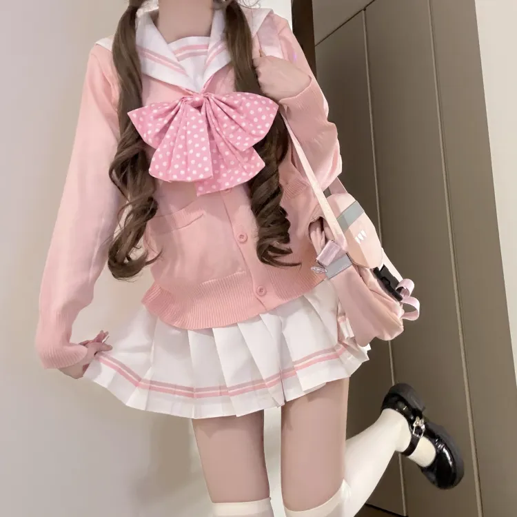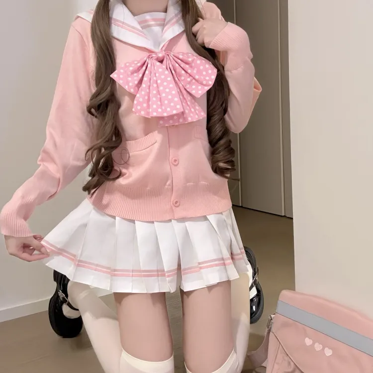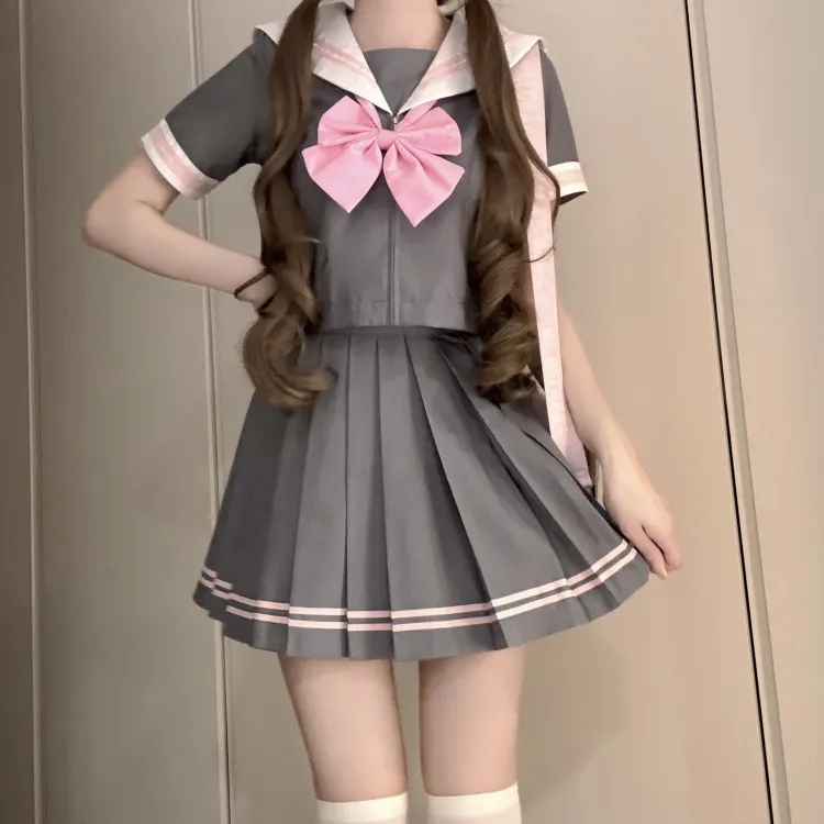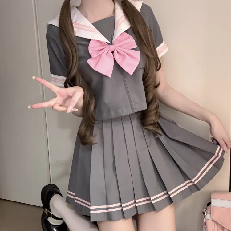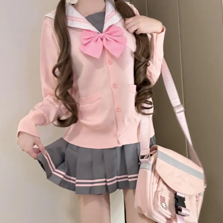 Серый Розовый Матроска 4-Предметный Комплект (Серый Розовый Топ + Юбка с Плиссировкой + Розовый Бант + Розовый Кардиган) с Бумажной Картой в Пакете