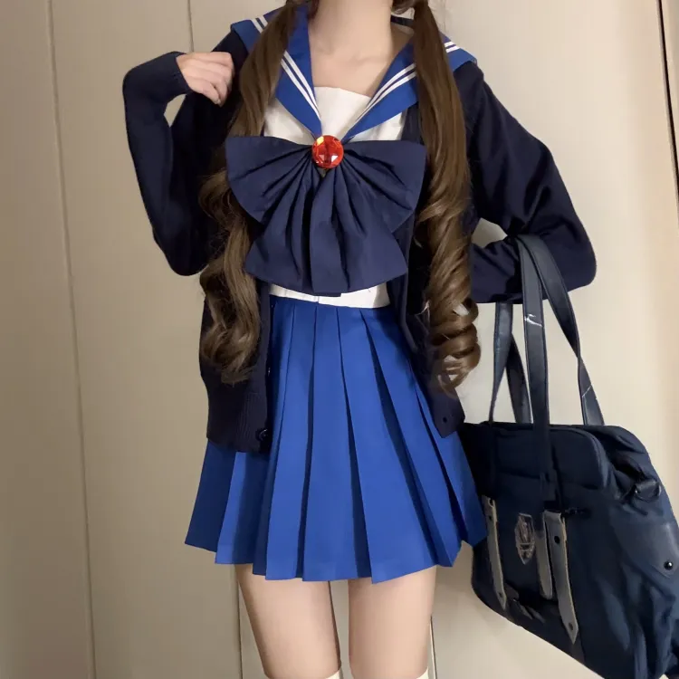Синий матроска трехкомпонентный комплект (синий матроска комплект одежды + темно-синий кардиган) с бумажной картой в сумке