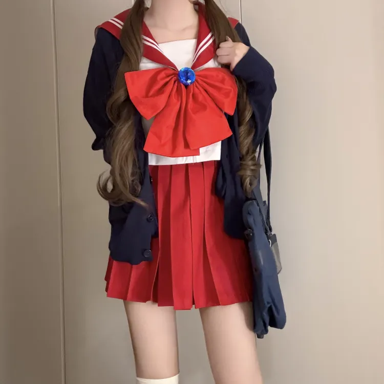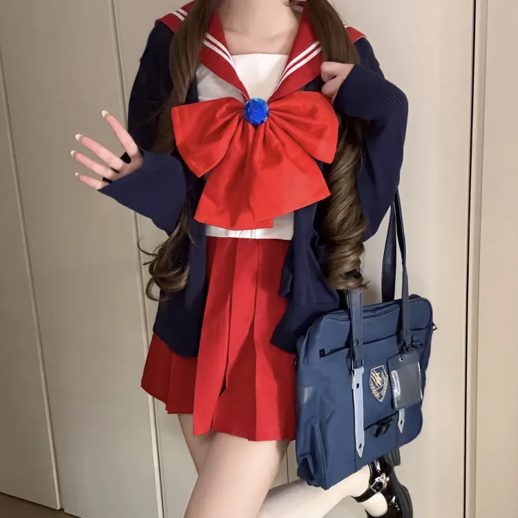 Красный матроска трехкомпонентный комплект (красный матроска комплект одежды + темно-синий кардиган) с бумажной картой в пакете