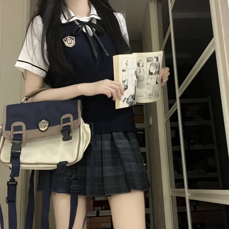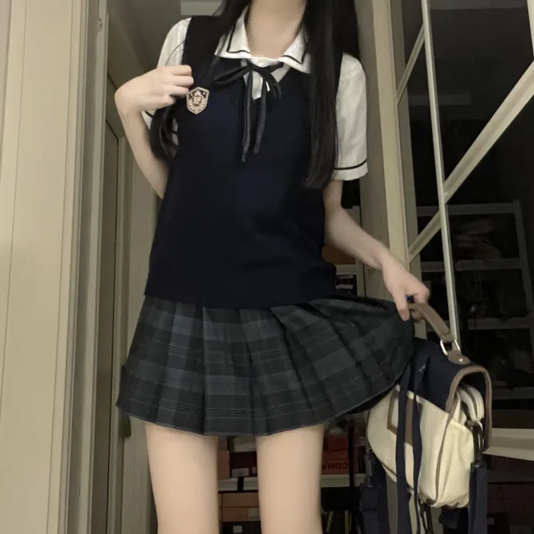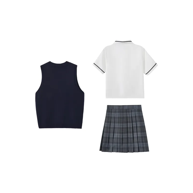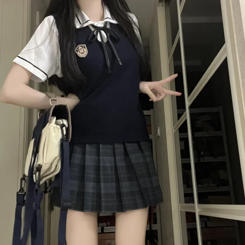 KAZAN Жилет FIVE Набор Темно-синий Жилет + Значок + Черный Полосатый Белая Рубашка + Синяя и Черная Клетчатая Юбка + Галстук-бабочка Женская Униформа