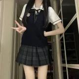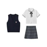 Жилет пятипарный комплект (Темно-синий жилет + значок + черно-полосатая белая рубашка + синяя и черная клетчатая юбка + галстук-бабочка)