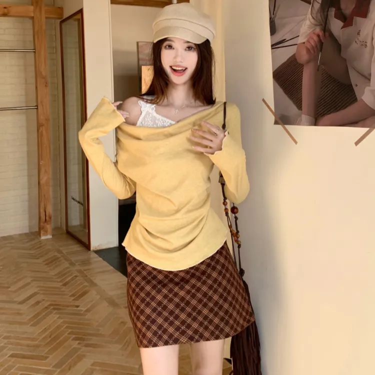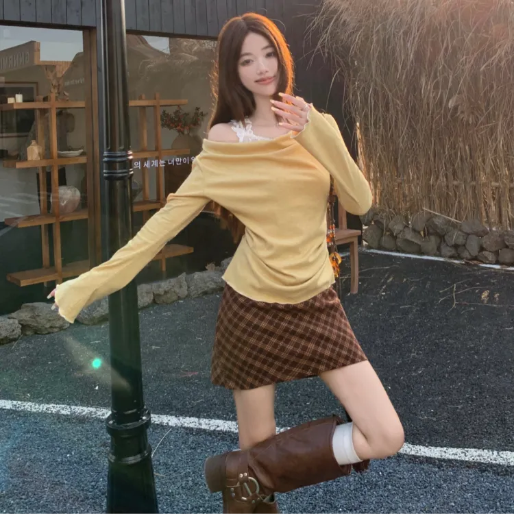 Желтый топ 3418 + красная клетчатая юбка 3419, комплект из двух предметов (включена сумка для покупок)