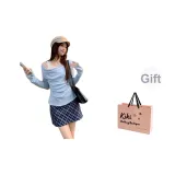 Синий топ 3418 + синяя клетка юбка 3419, комплект из двух предметов (включена сумка для покупок)