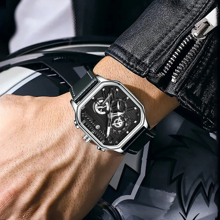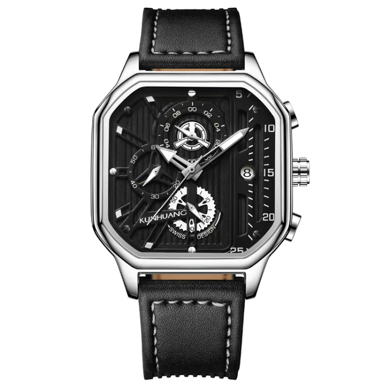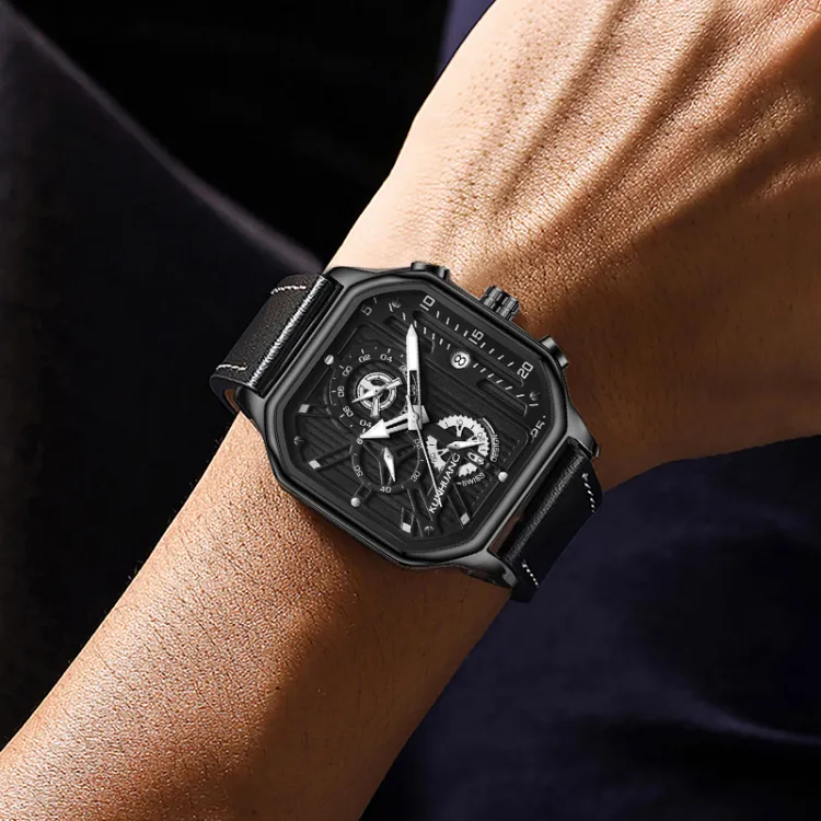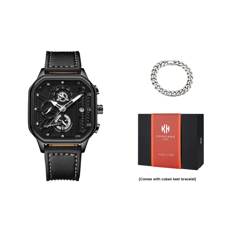 KUN HUANG Кварцевый механизм Кожаный ремешок Часы Мужские Черный циферблат