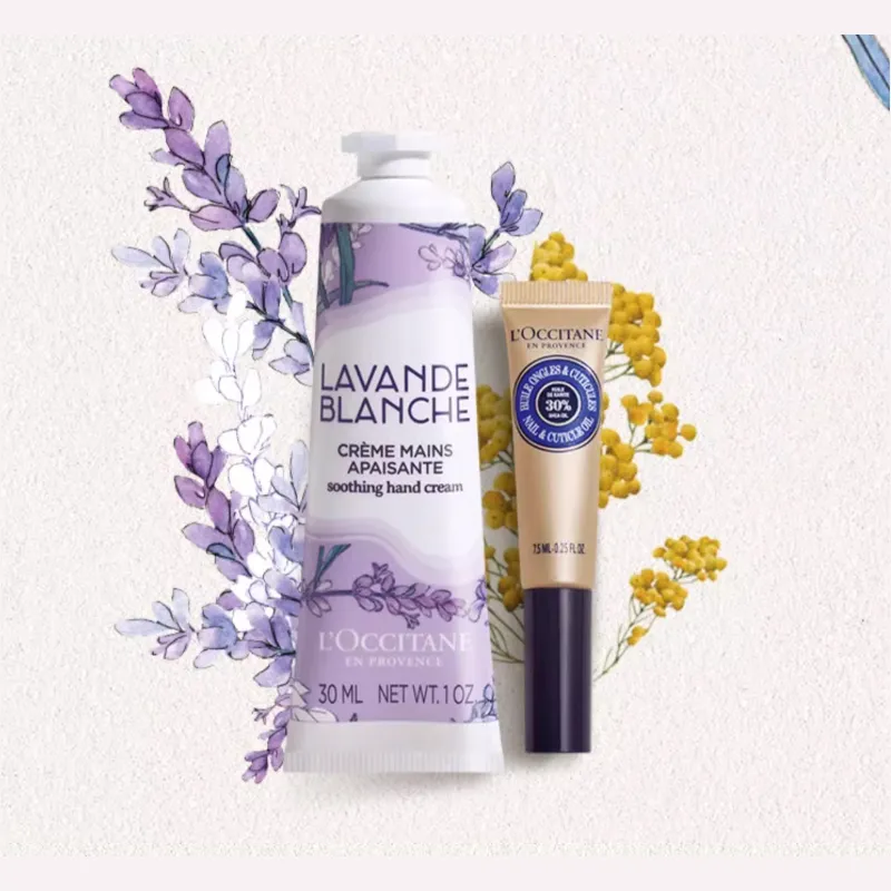 Комплект:Двухкомпонентный комплект: Белый крем для рук с ароматом лаванды 30 мл + Масло для ногтей с питательным эффектом из ореха ши 7,5 мл