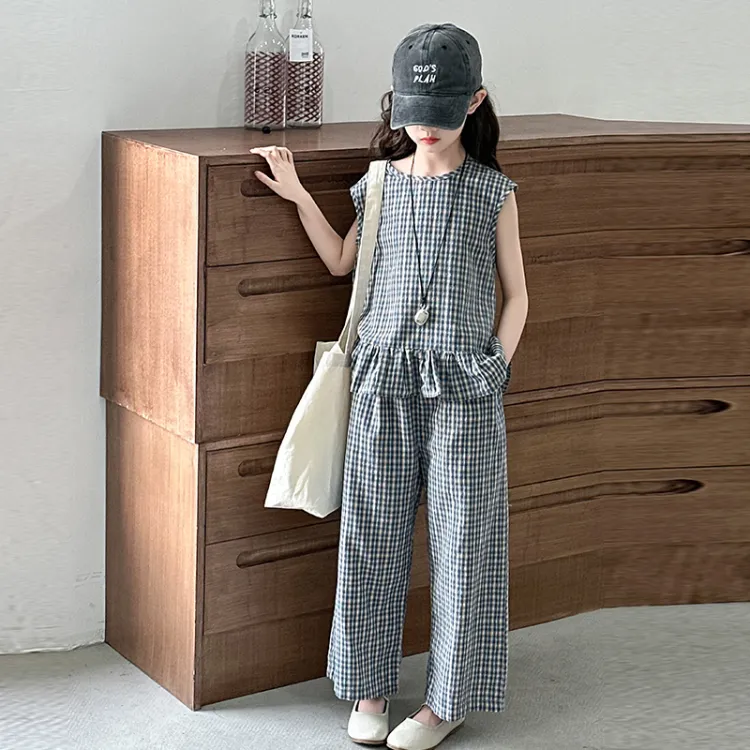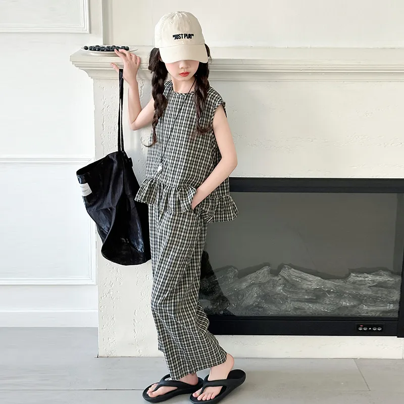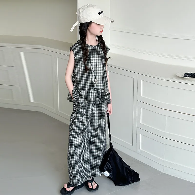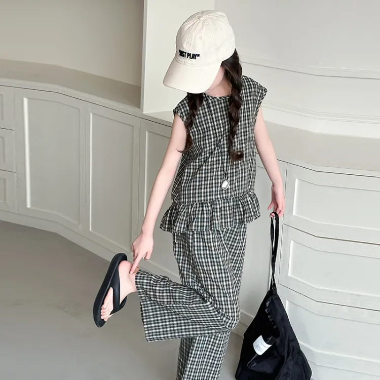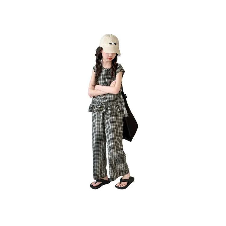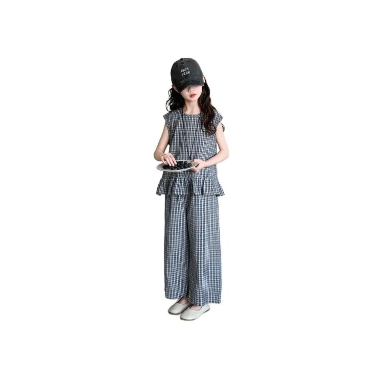 La Cergo Корейский стиль Клетчатый Без рукавов T-рубашка + Брюки Повседневная Спортивная одежда для детей