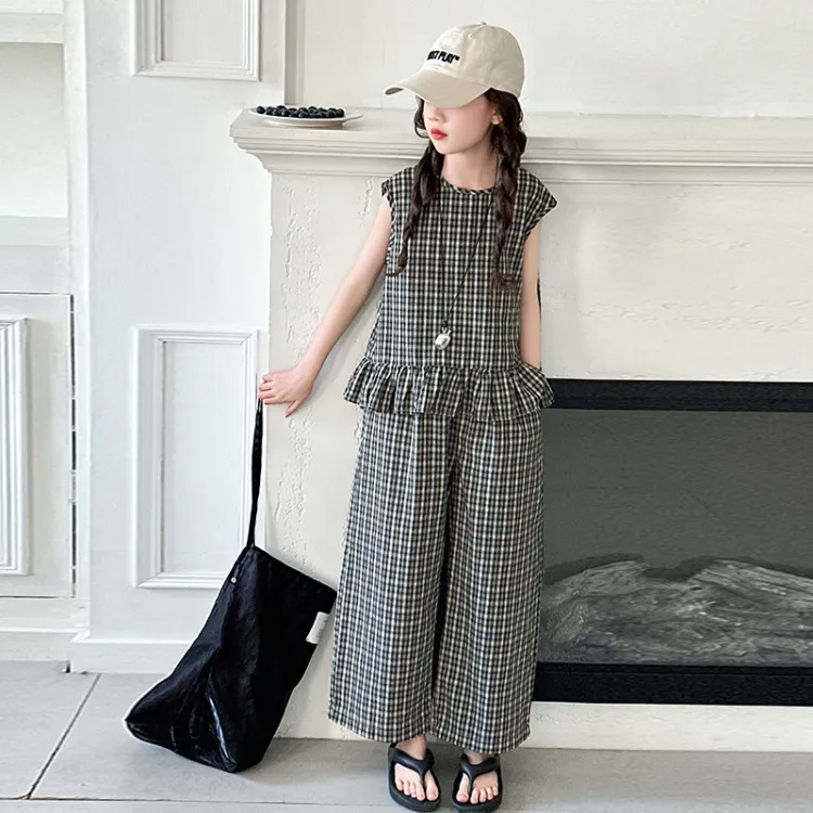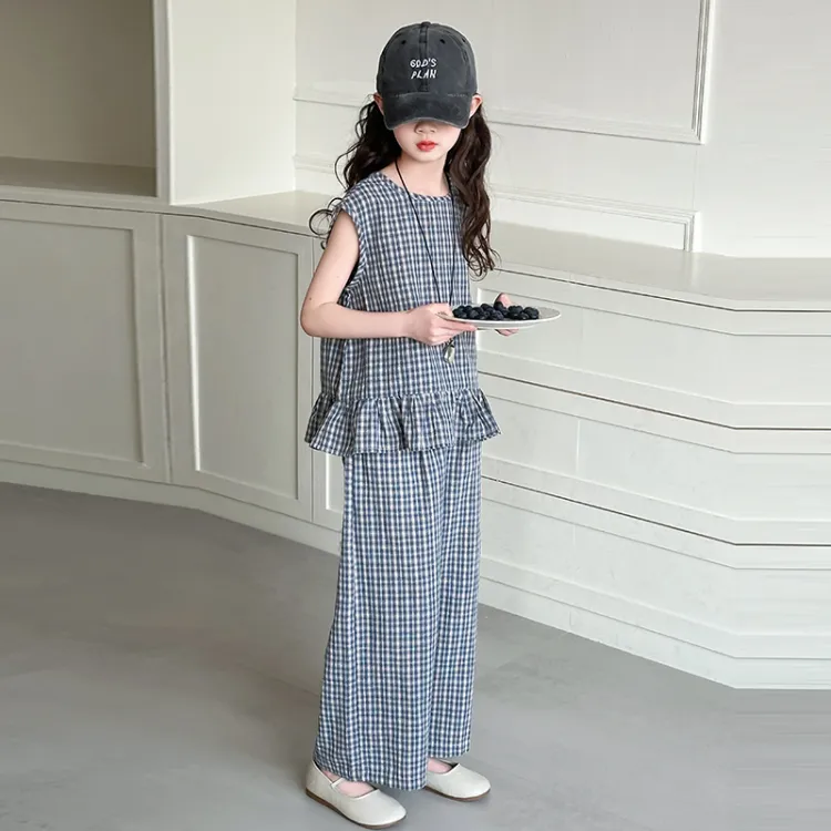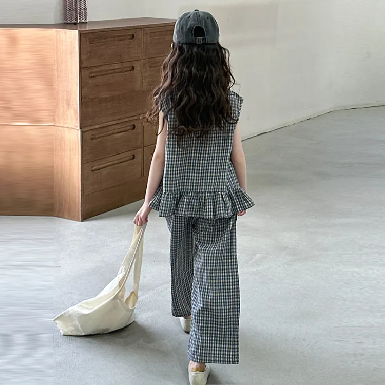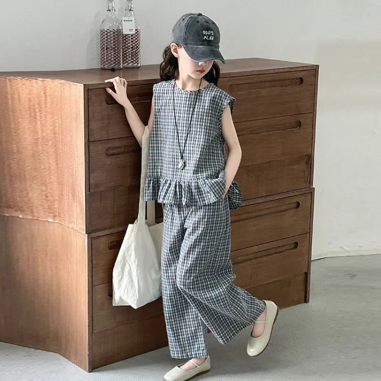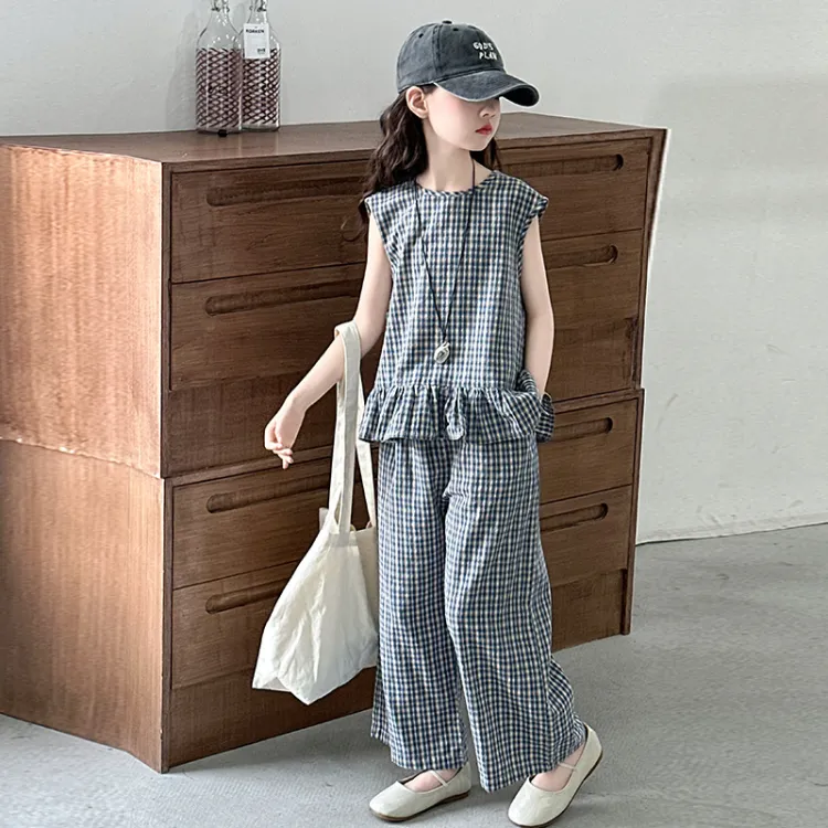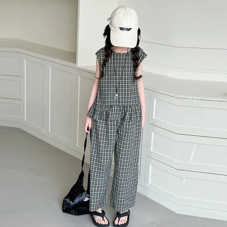 La Cergo Корейский стиль Клетчатый Без рукавов T-рубашка + Брюки Повседневная Спортивная одежда для детей