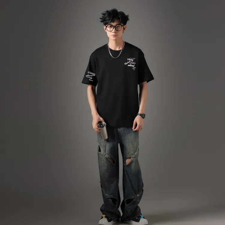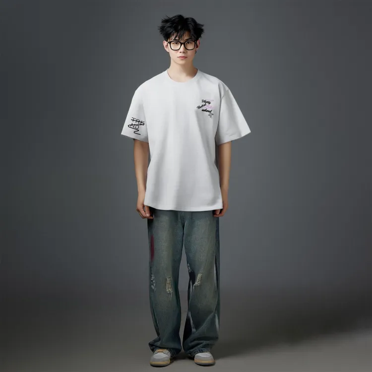 Комплект одежды (Черная футболка + Белые штаны с серым фотинией, повседневные штаны)