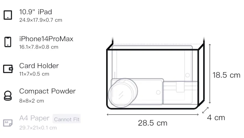 Длина (размер в длину) 28,5 см, Ширина корпуса 4 см, Длина корпуса 18,5 см