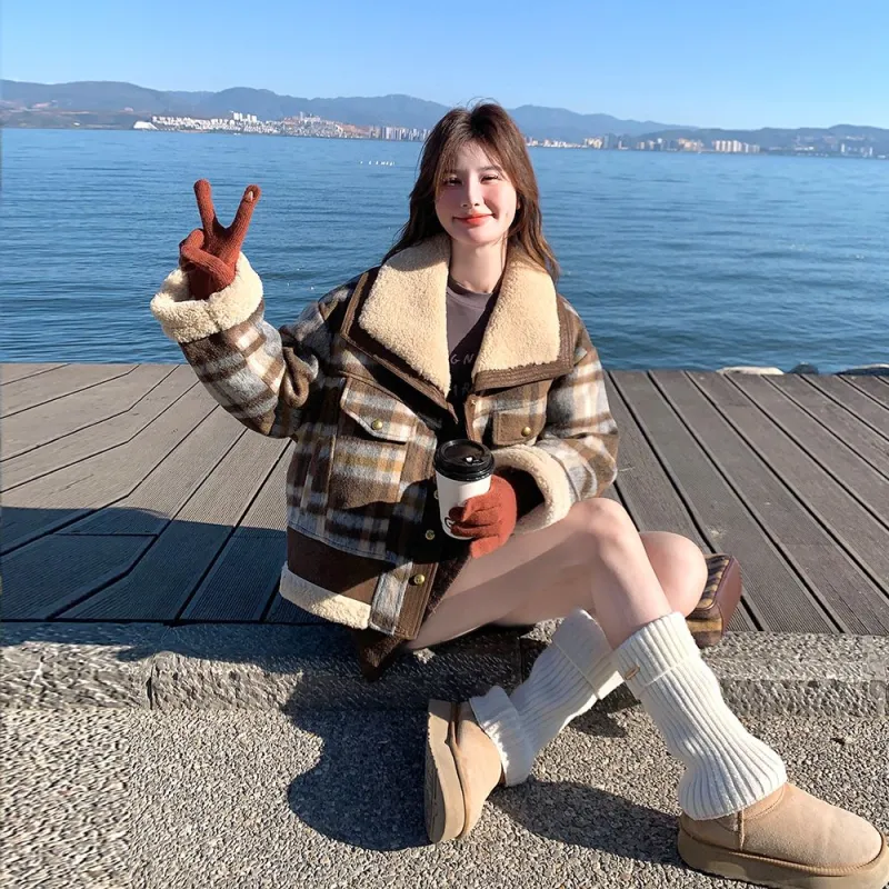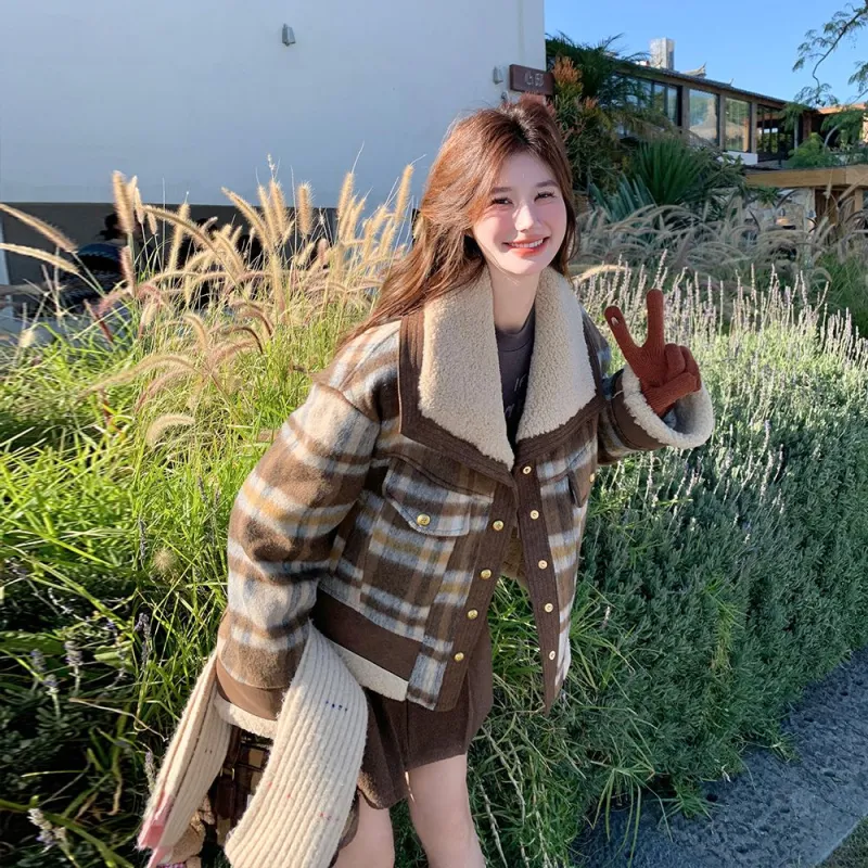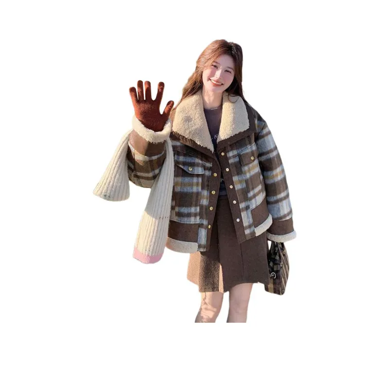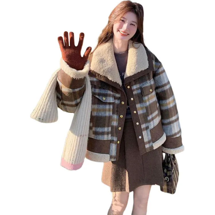 Langqing Кофейная клетка Утолщенный Утепленный Подкладка С подарками Langqing Наклеенный Женские Короткие пальто