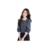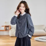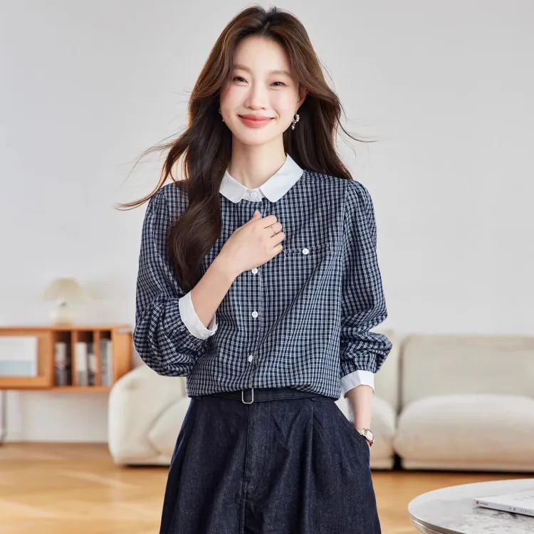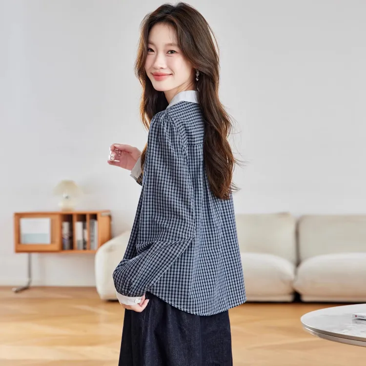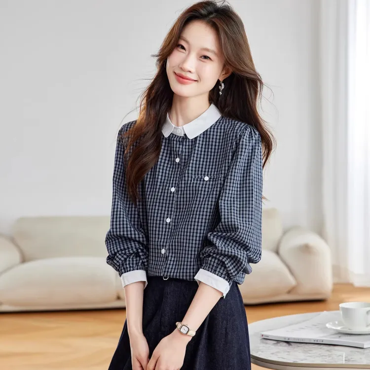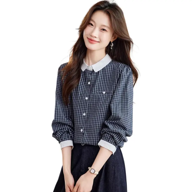 Langqing Синяя клетка С подарками Langqing Наклеенный Женские Рубашки