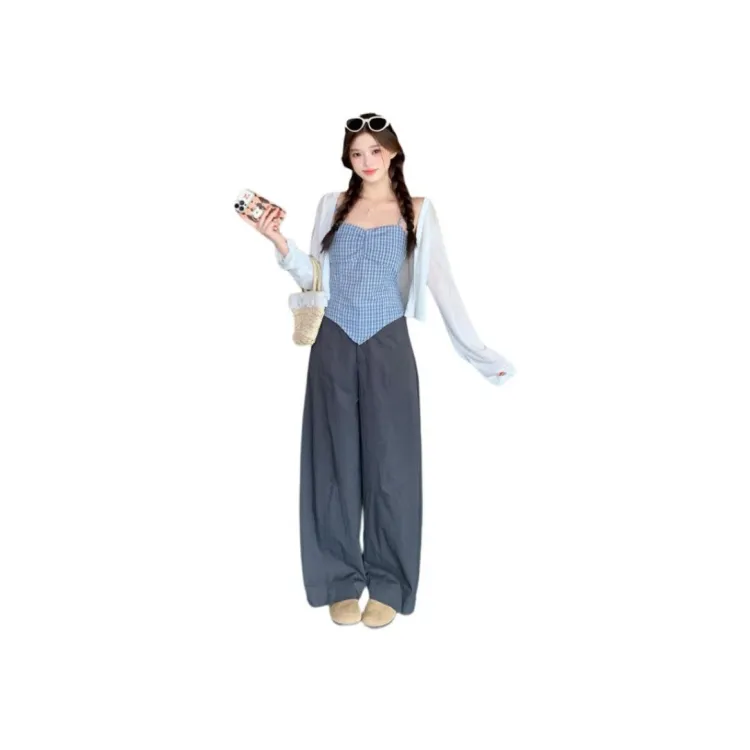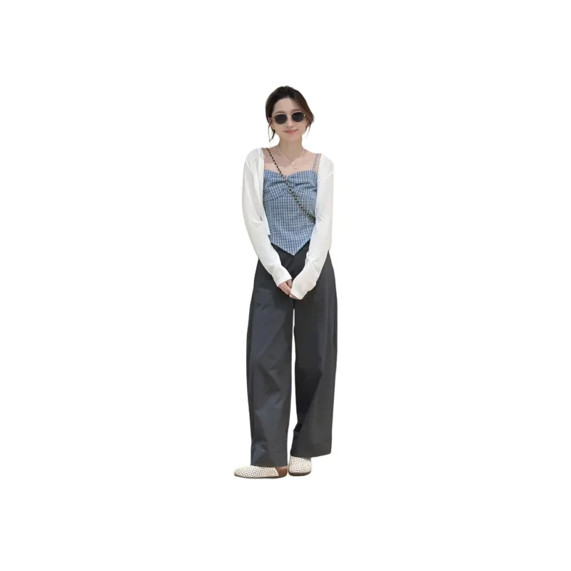 Белый кардиган + светло-синий топ с бретелями + серые штаны