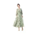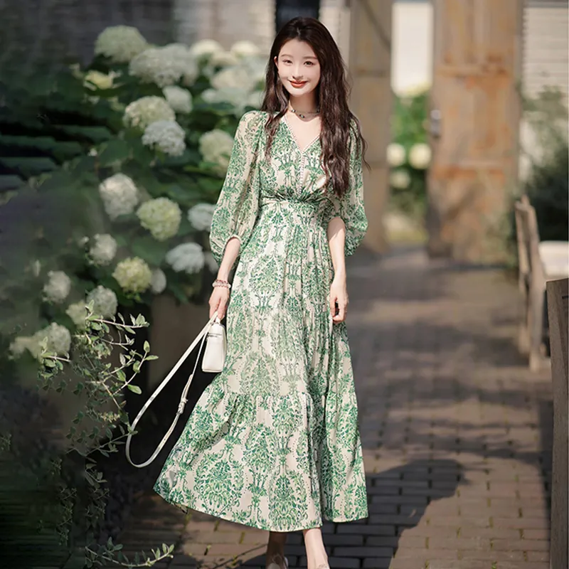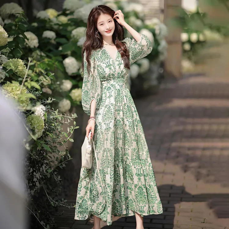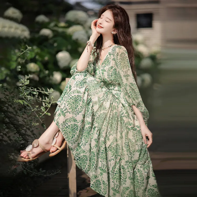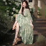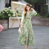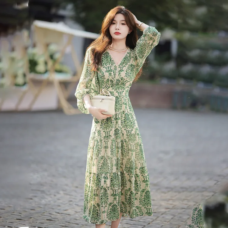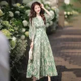 Длинное платье с длинными рукавами женское бежевый с зеленым принтом