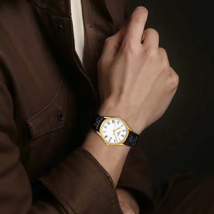 LONGINES Lvya Collection Кварцевый механизм Мужские часы 38,5 мм Белый циферблат PVD покрытие Корпус часов Натуральная кожа Ремешок