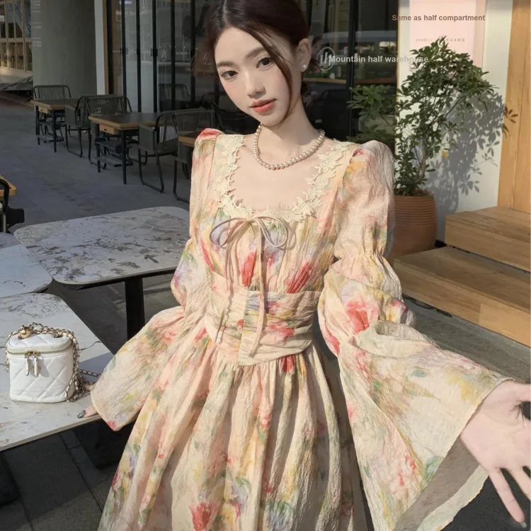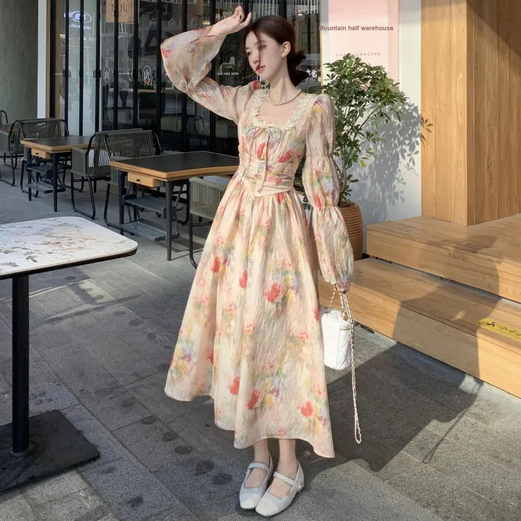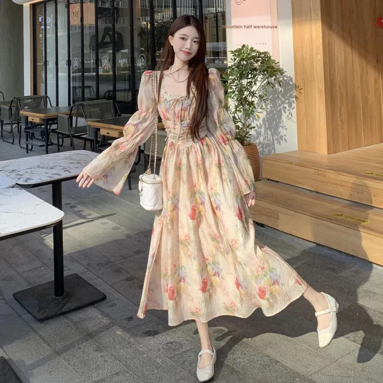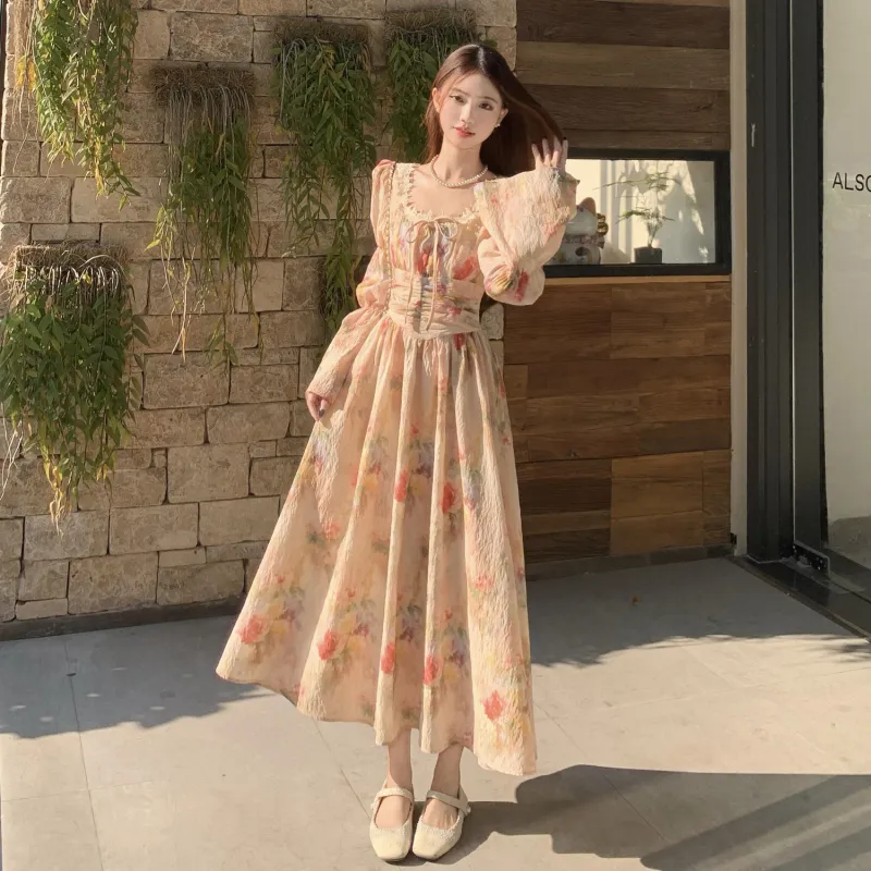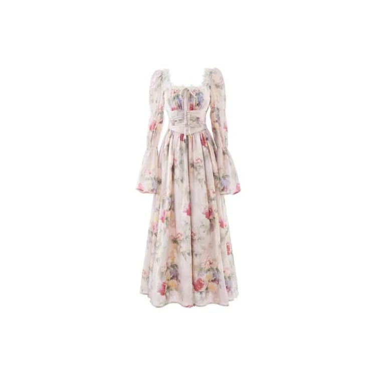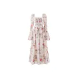 Lookinto Длинное платье с длинными рукавами женское винтажное розовое