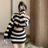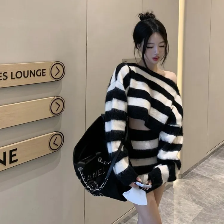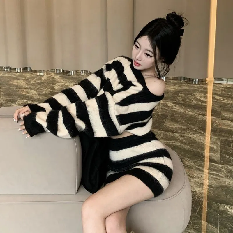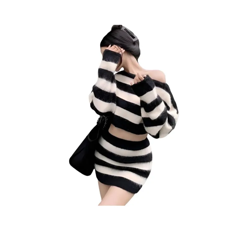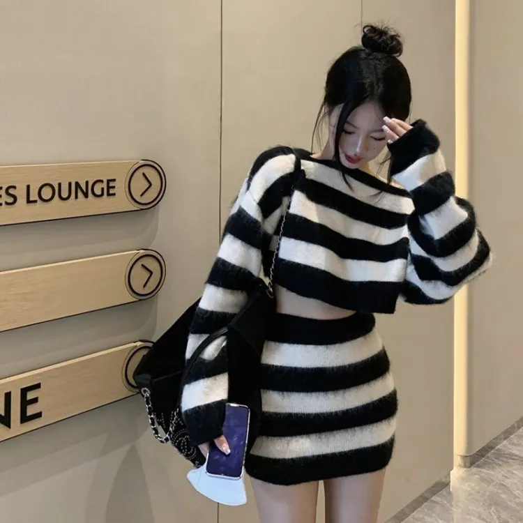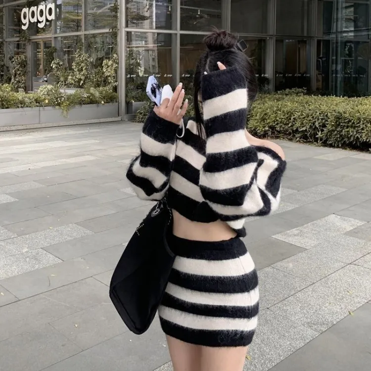 MDEHT Черно-белые полосы Комплекты одежды Женские Юбка-комплект