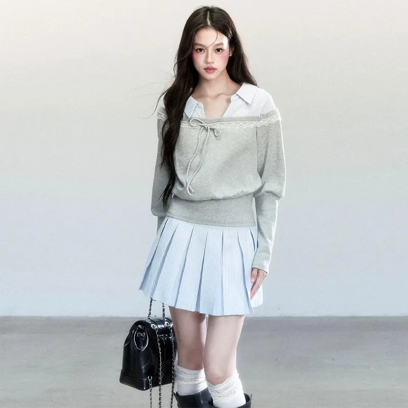 MDEHT Серый топ + Синяя юбка Женские комплекты с юбкой
