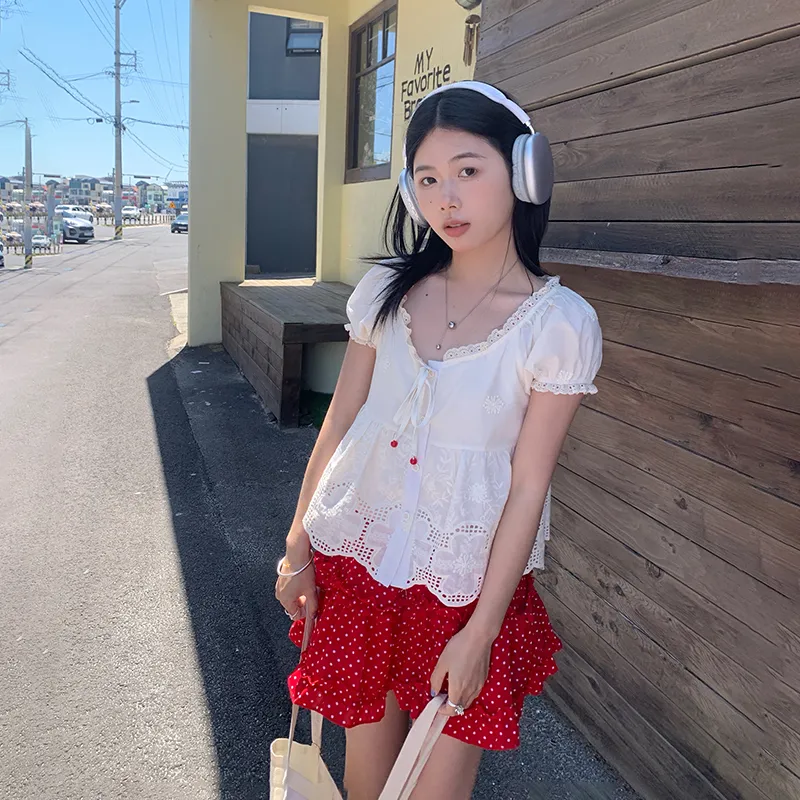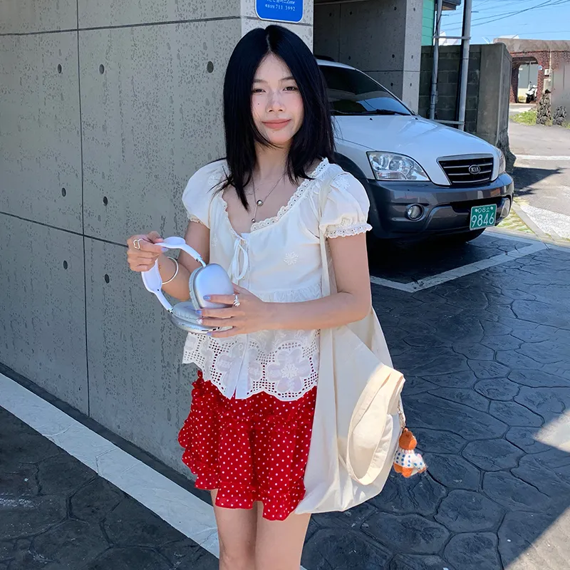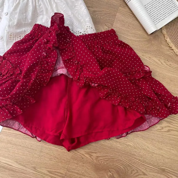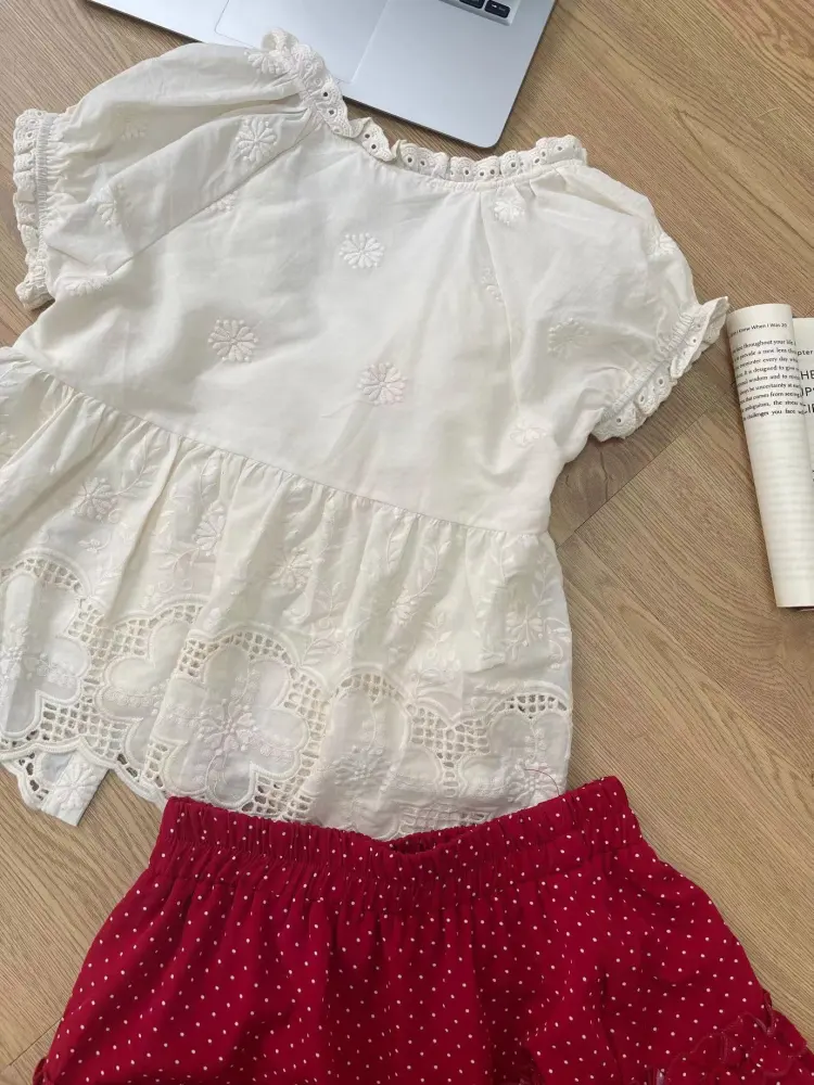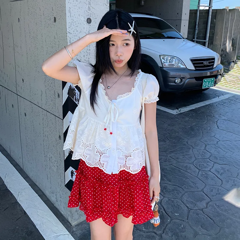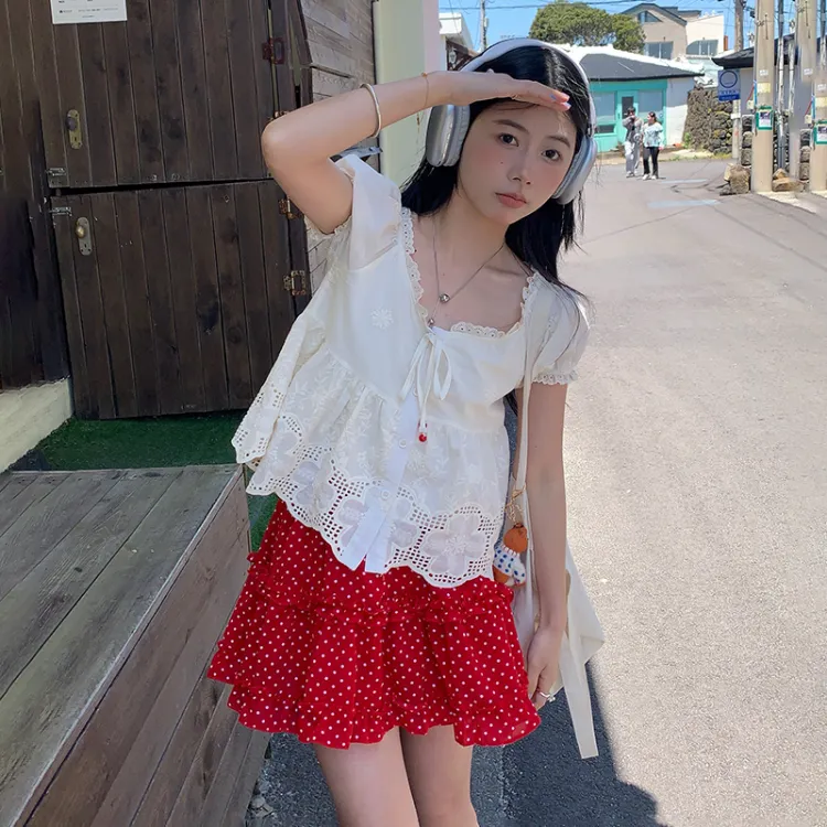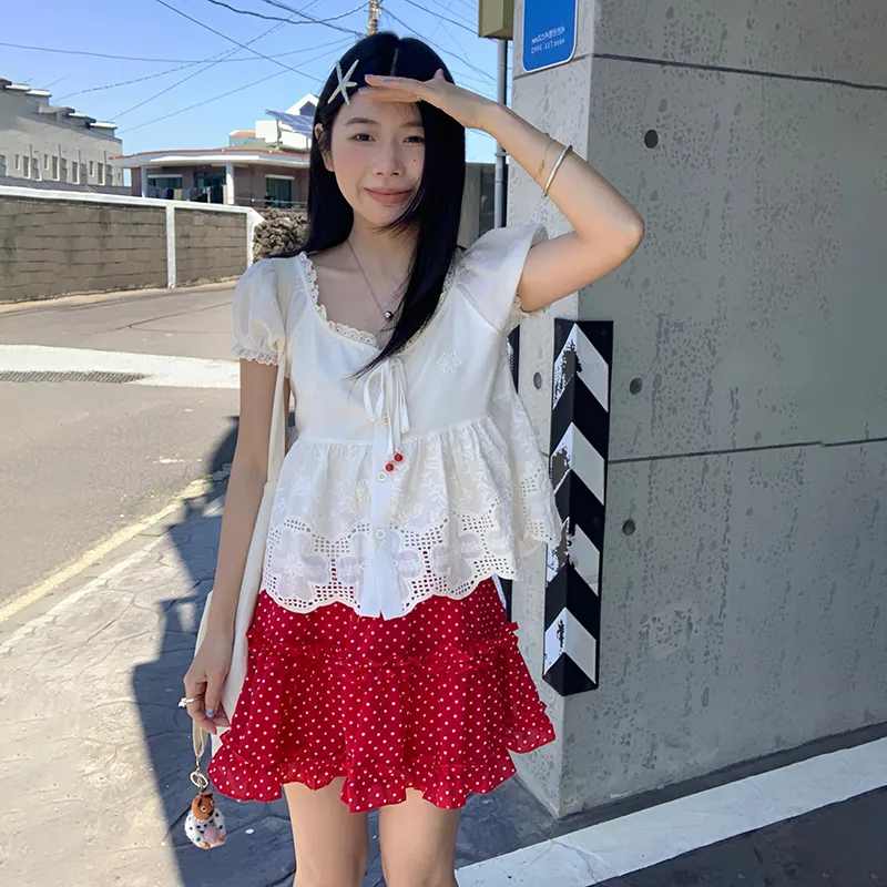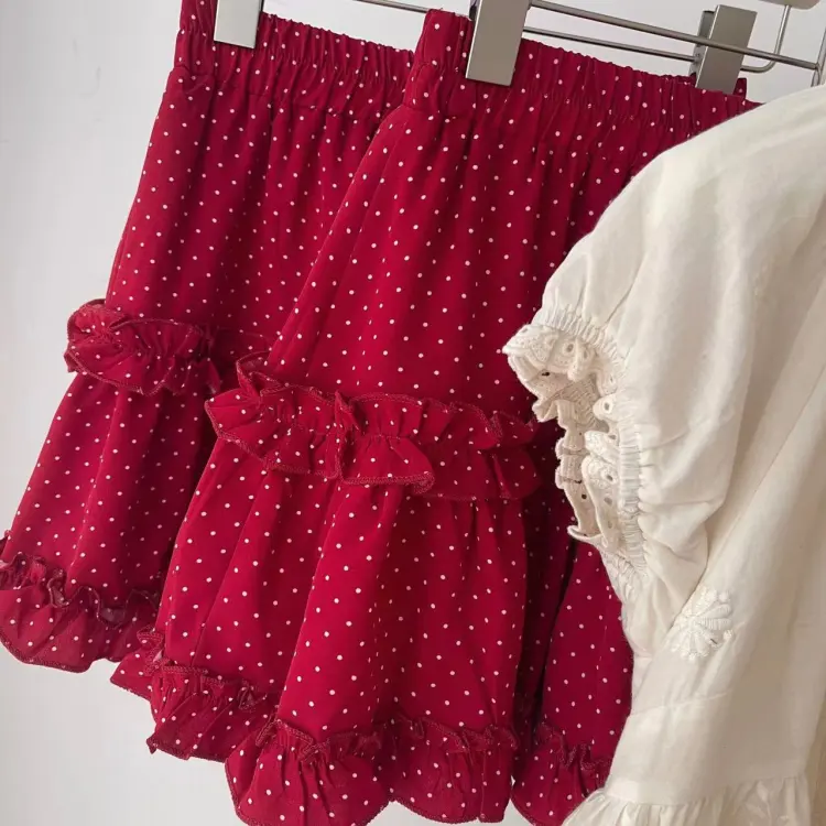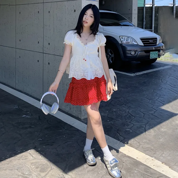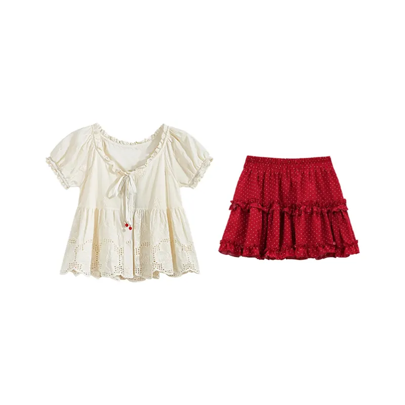 Абрикосовый топ + Юбка с красным гороховым узором, комплект одежды