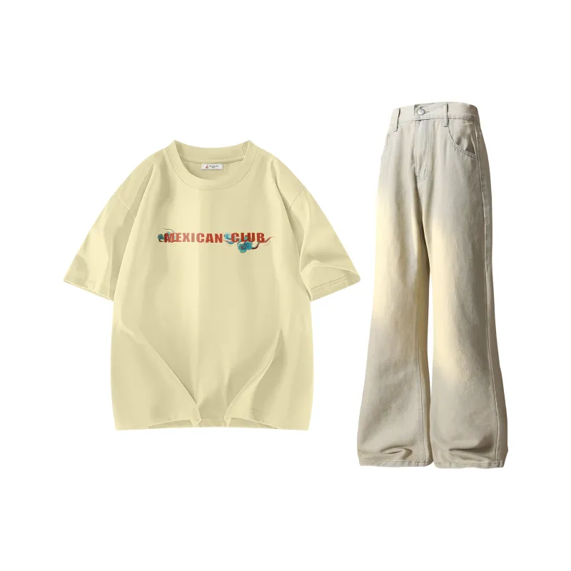 Комплект:Комплект одежды (Абрикосовая короткая футболка с коротким рукавом + желтые грязные штаны)