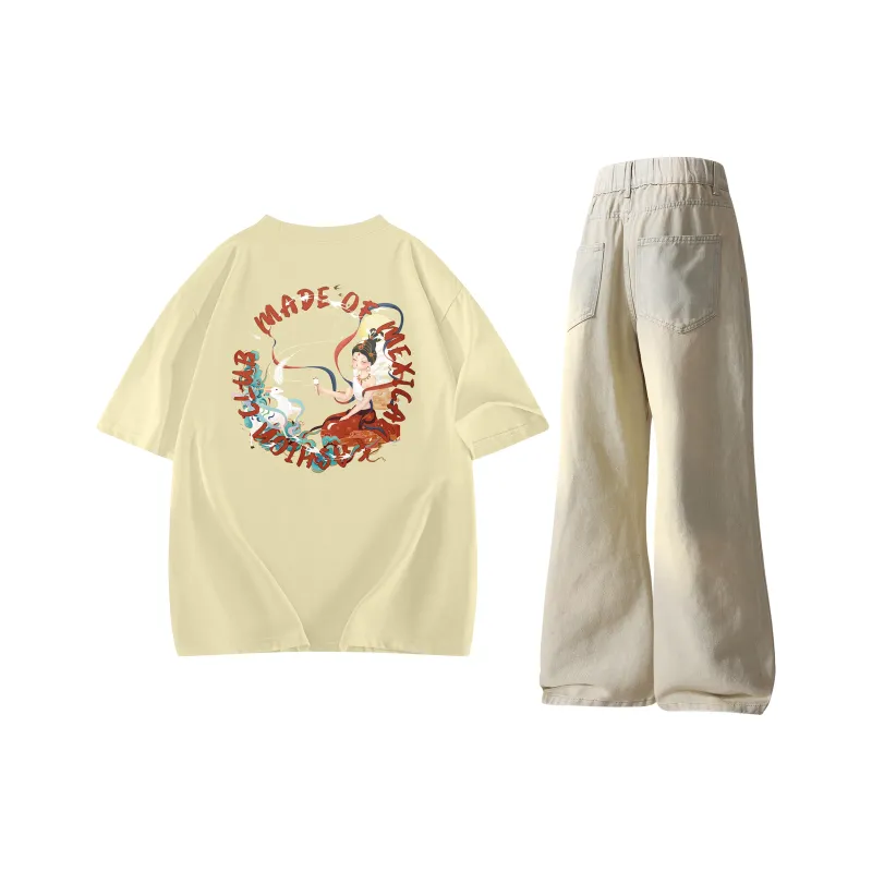 Комплект одежды (Абрикосовая короткая футболка с коротким рукавом + желтые грязные штаны)