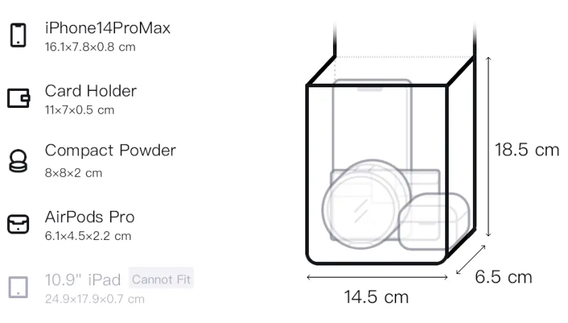 Большая сумка: длина (размер в длину) 14,5 см, ширина корпуса 6,5 см, длина корпуса 18,5 см / Маленькая сумка: длина (размер в длину) 10 см, длина корпуса 6,5 см