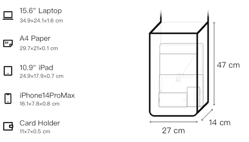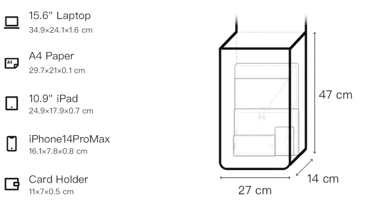 Стандартная версия: Длина (размер в длину): 27 см, Ширина корпуса: 14 см, Длина корпуса: 47 см Экстра-большой: Длина (размер в длину): 31 см, Ширина корпуса: 18 см, Длина корпуса: 54 см