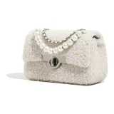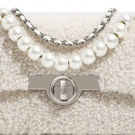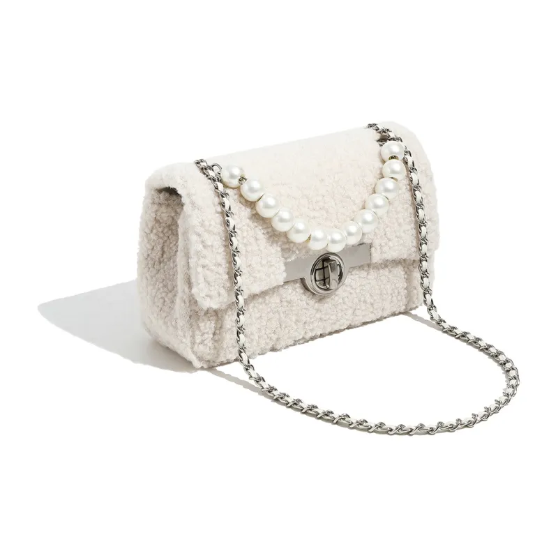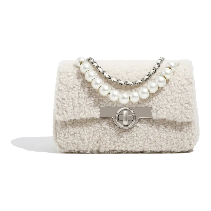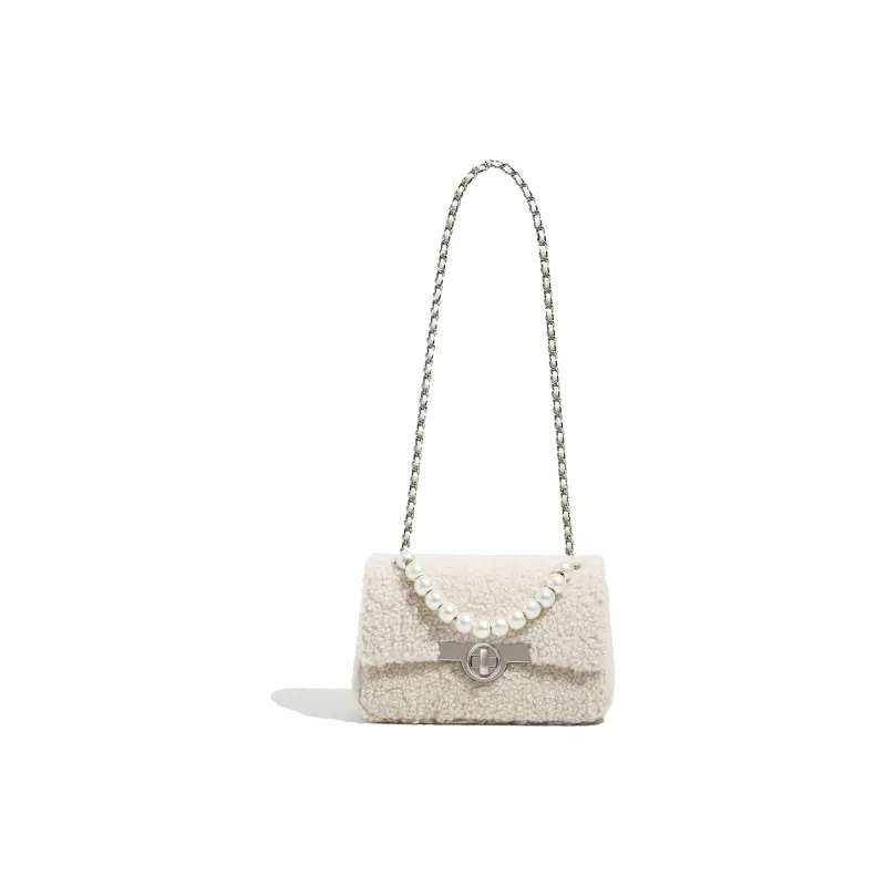 Miss Kung Шерсть Овечья шерсть Маленькая квадратная сумка Сумка с цепочкой Жемчужная сумка Сумка через плечо Сумка на плечо Обычная женская экрю