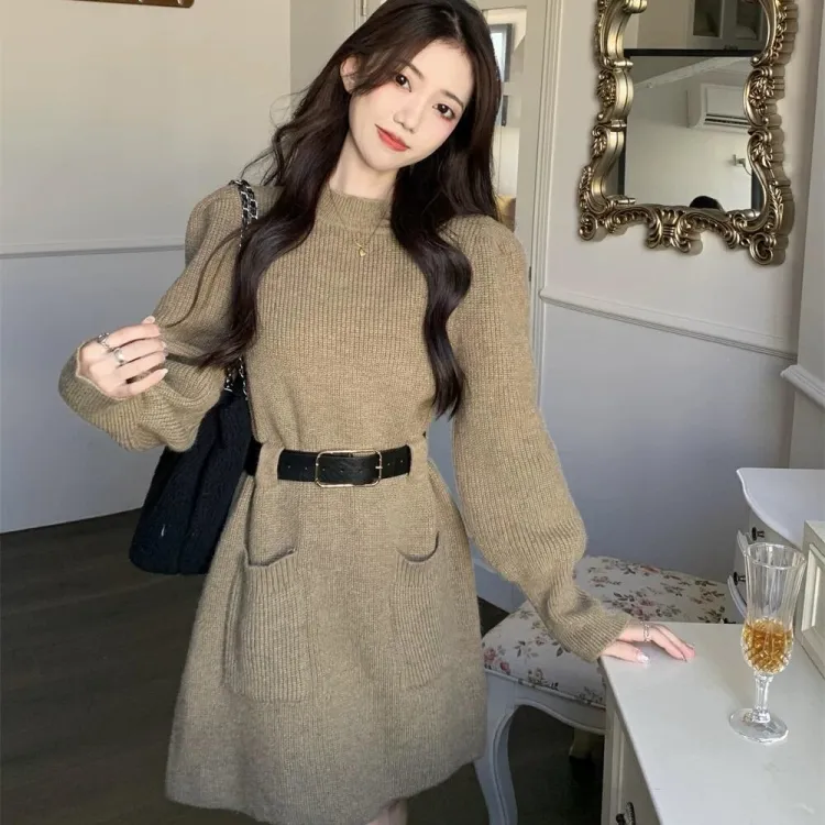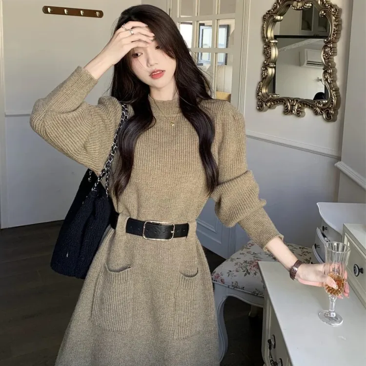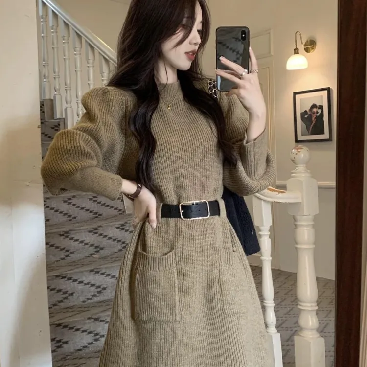 Кофейный, с длинным рукавом, платье