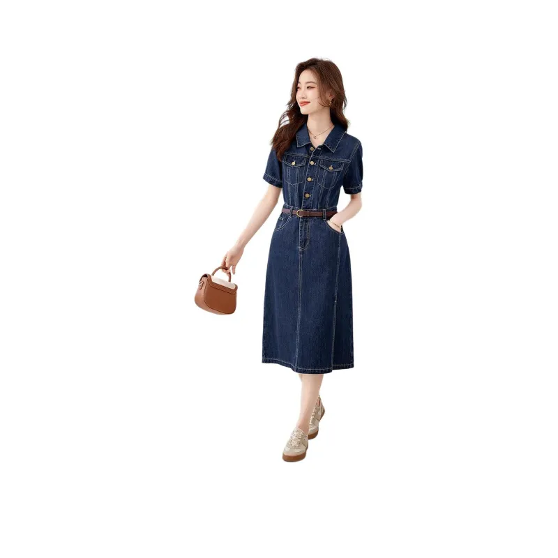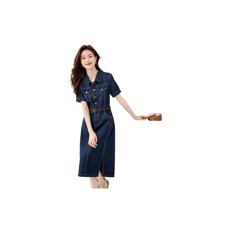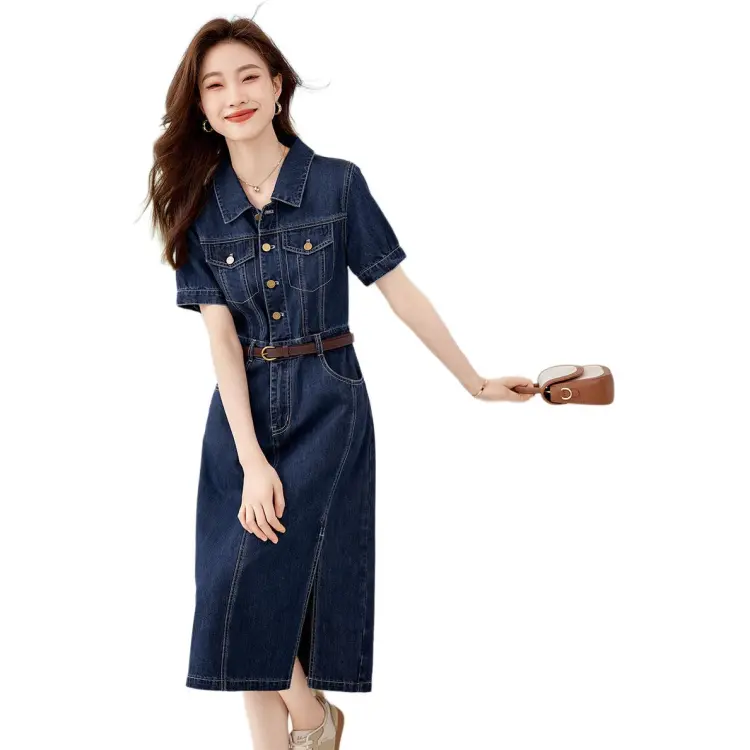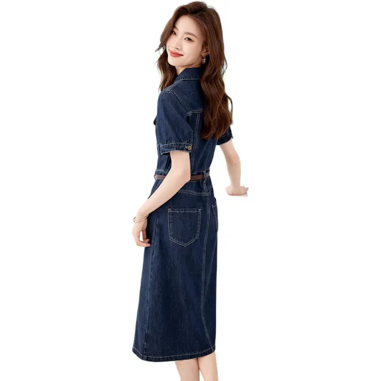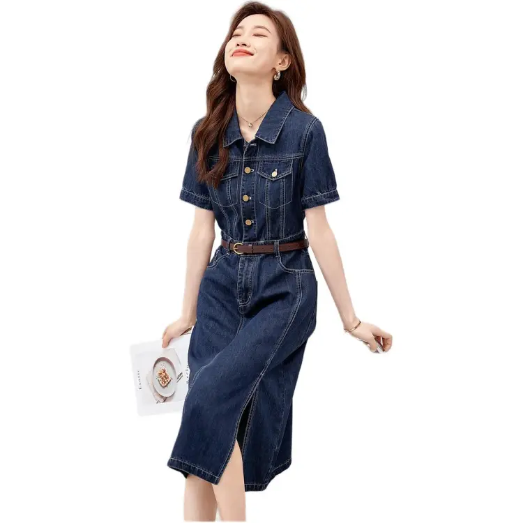 Mo Han Yi Mei Короткий рукав Платье Женское Джинсовый синий