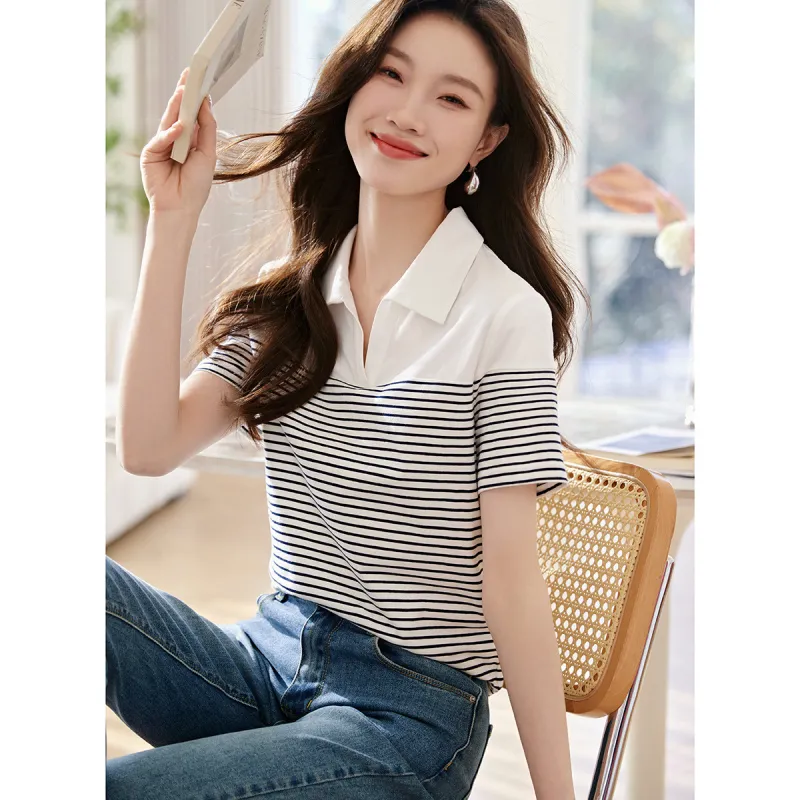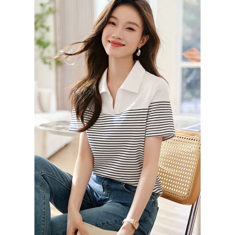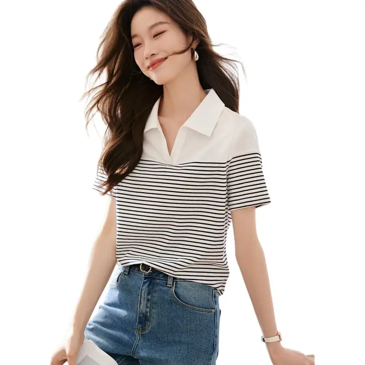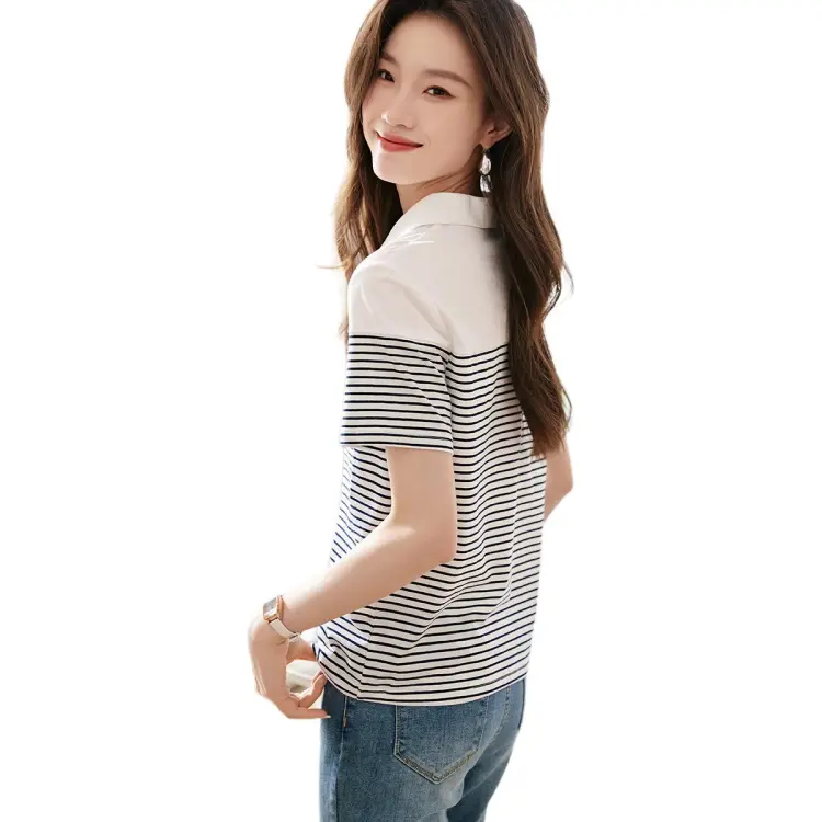 Mo Han Yi Mei T Рубашка Женская Темно-синий Белый Полосы