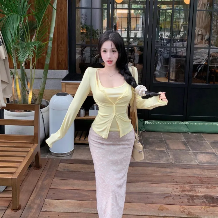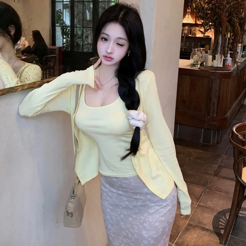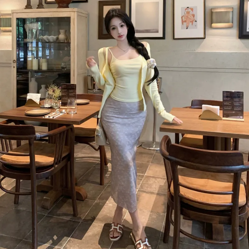 Кардиган + Топ на бретелях + Юбка