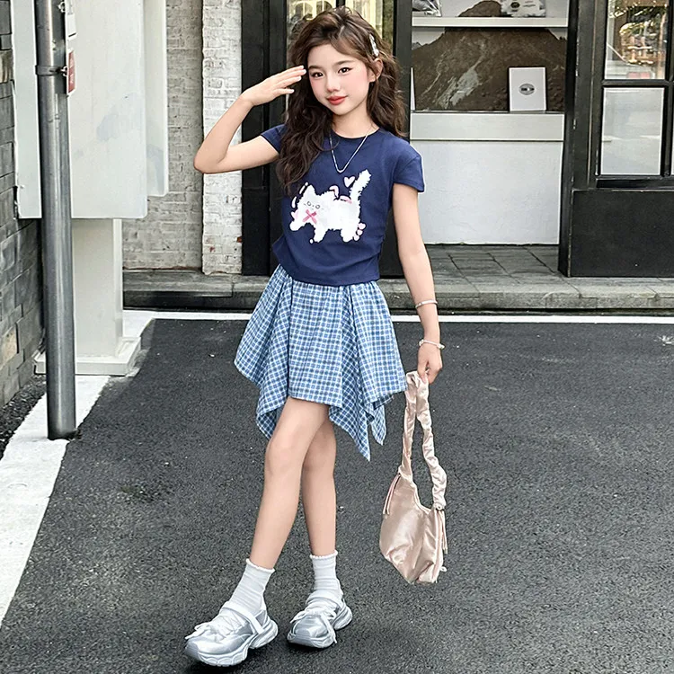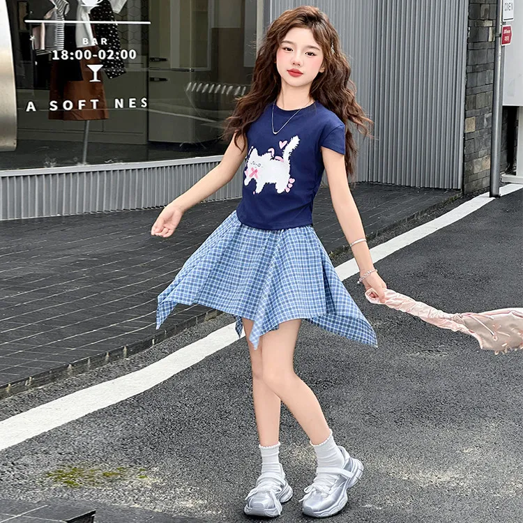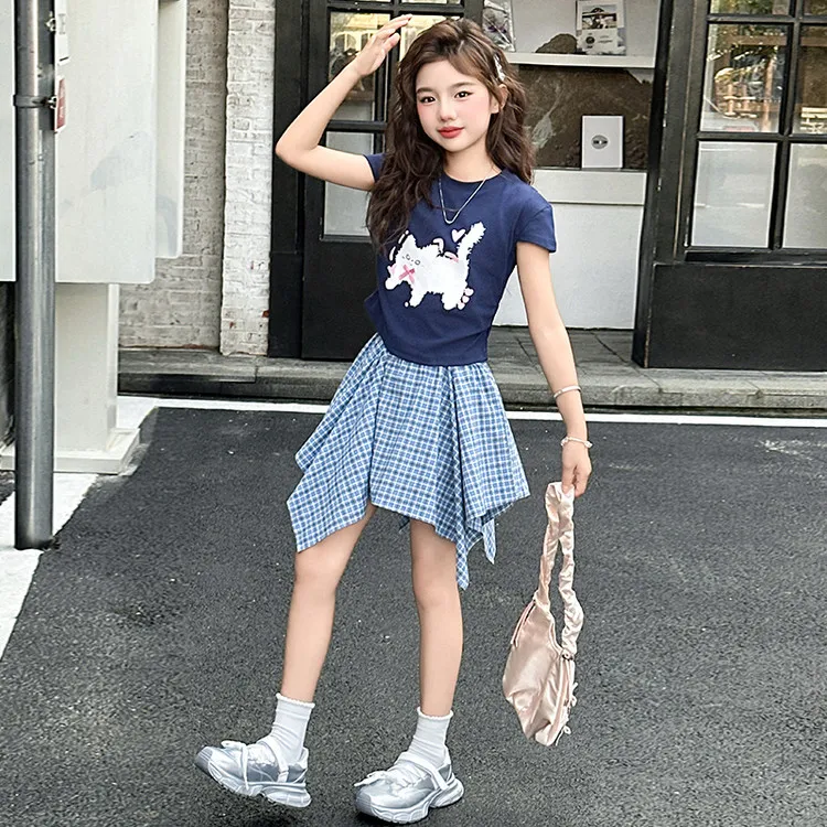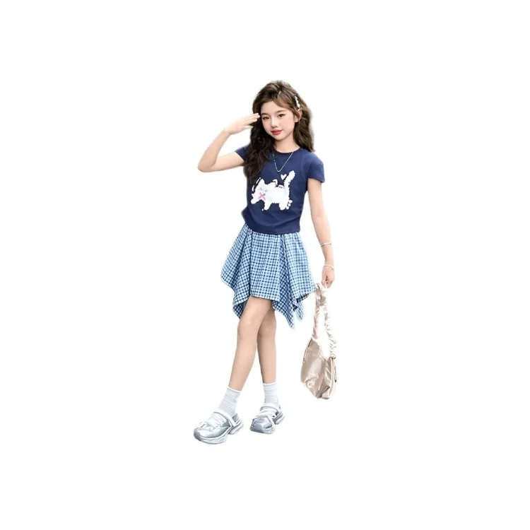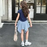 MUMUTU Темно-синий Синий Короткий рукав Топ + Синяя клетка Восемигранная Юбка Комплект Kids Юбка Комплекты