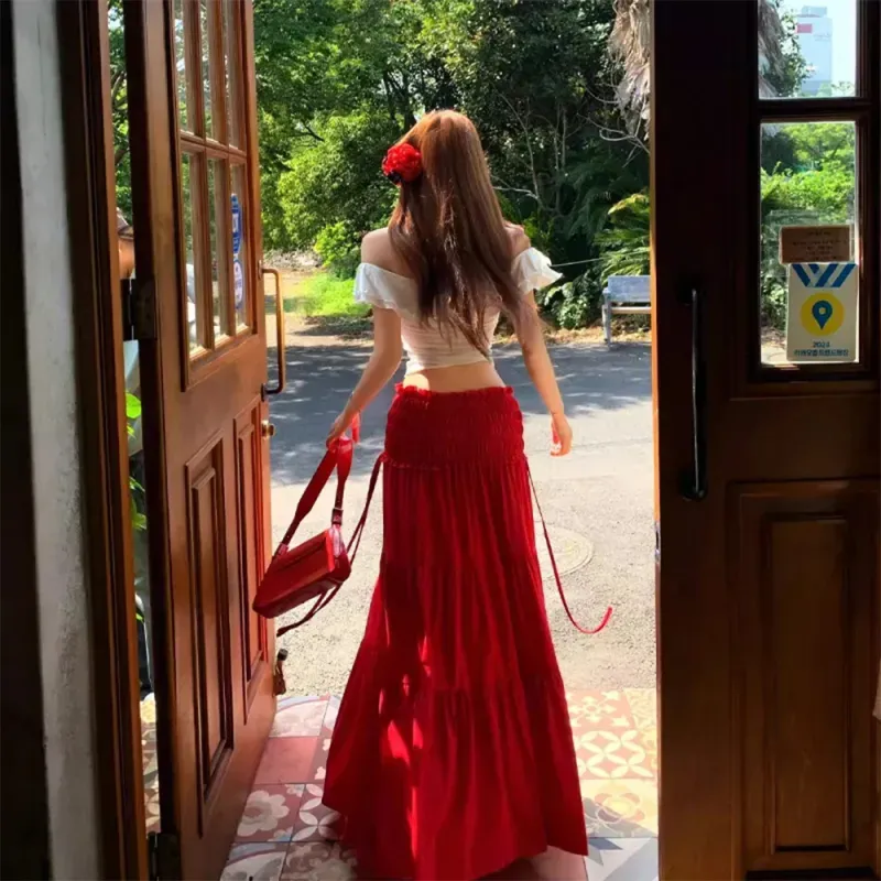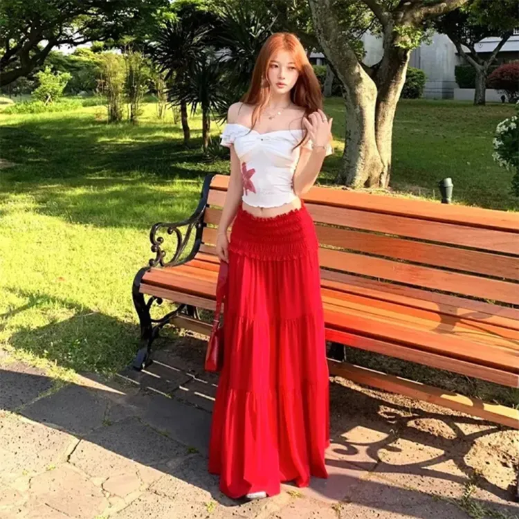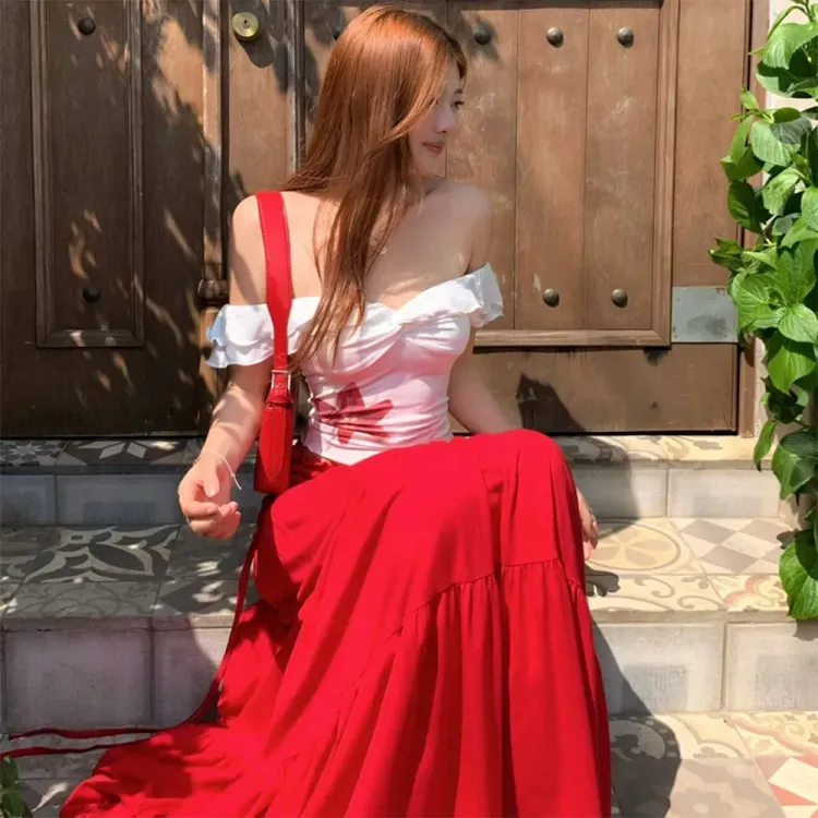 MUQINGQING Белый топ + Красная юбка Женские комплекты с юбкой