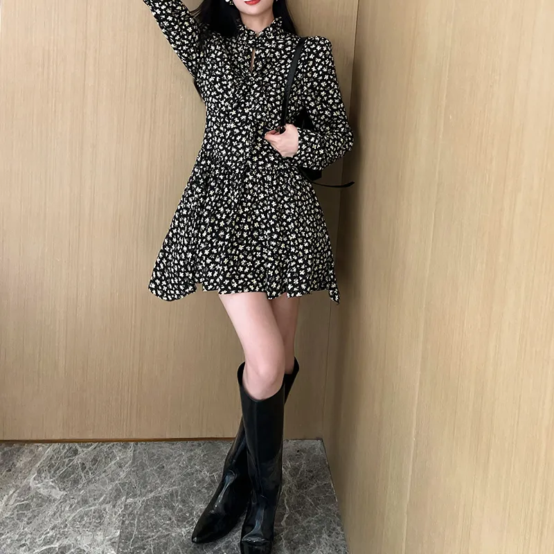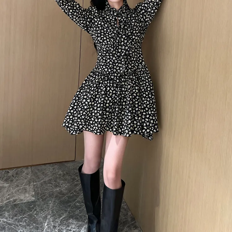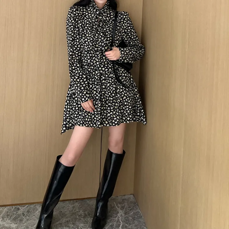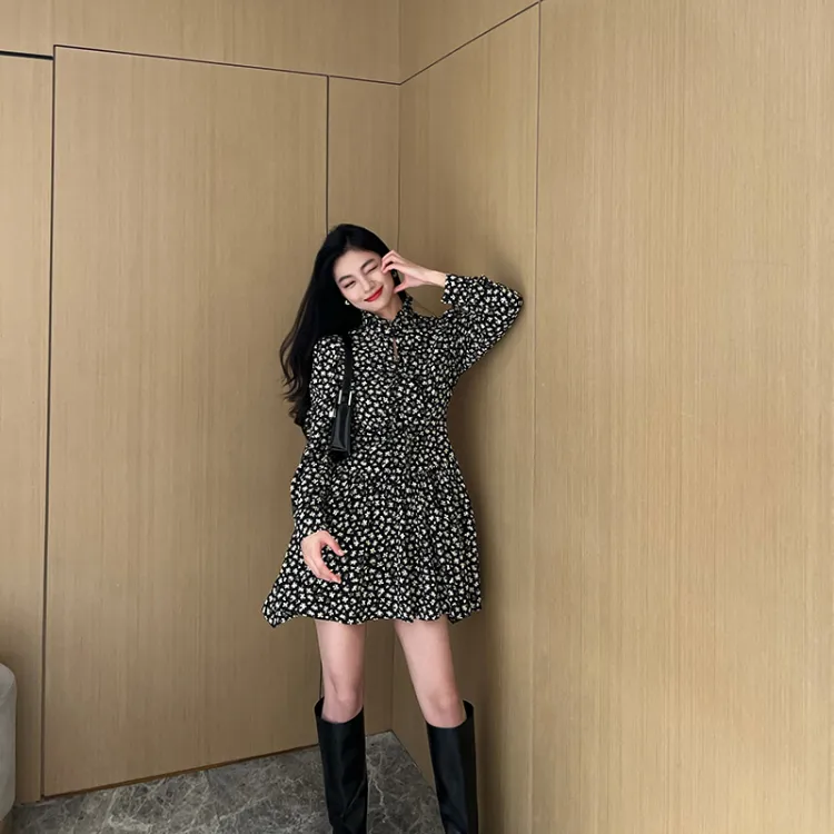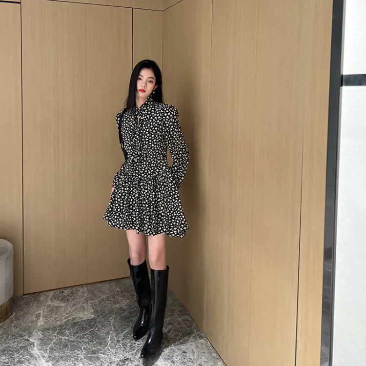 NancyCavally Черный и Белый с Цветочным Женское Длинное Платье с Рукавами