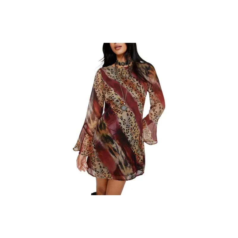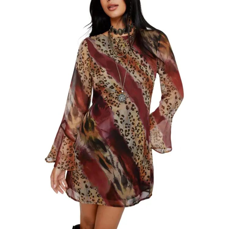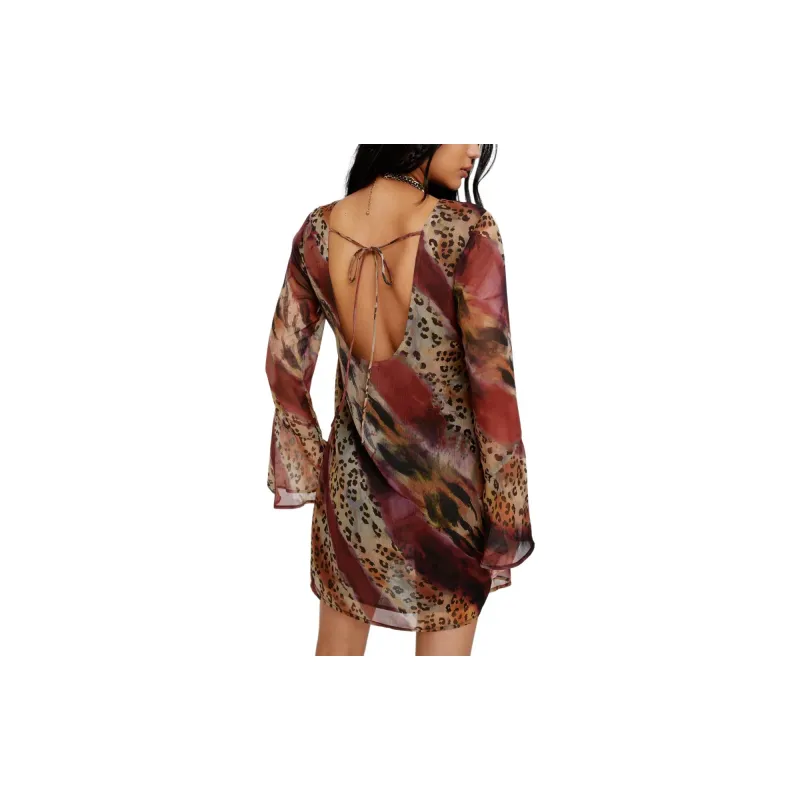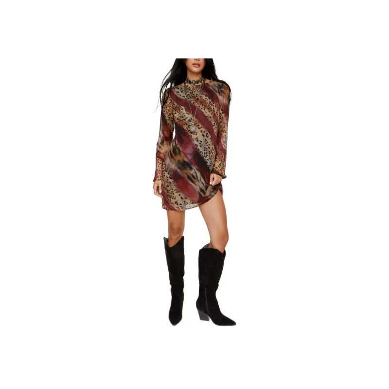 NASTY GAL Crinkle Шифон Животные Пышный Рукав Низкая Спина Мини Платье Длинное Платье с Рукавами Женское Бургунди