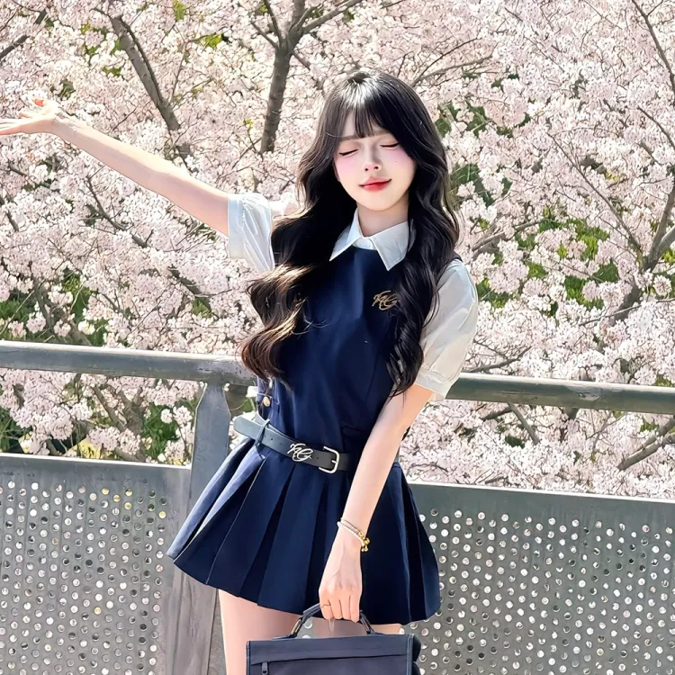 Комплект:Комплект одежды (Темно-синий сарафан + Белая рубашка с короткими рукавами)
