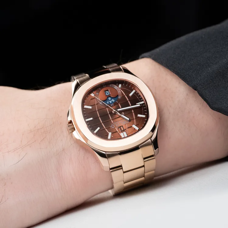 Коричневый циферблат, розовый ремешок.