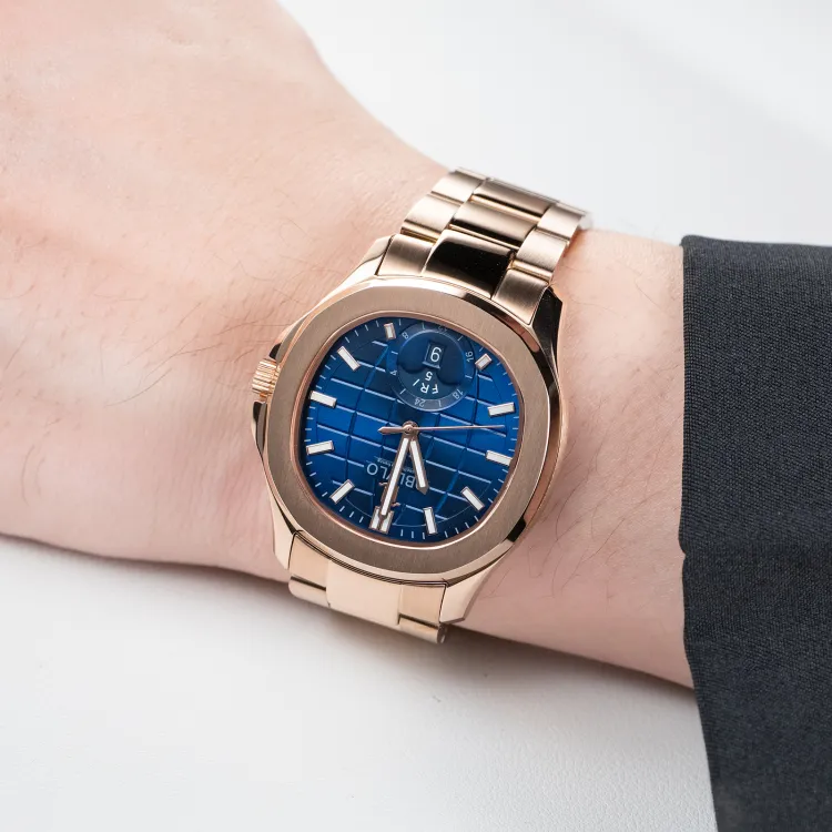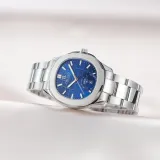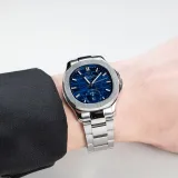 Серебряный корпус, синий циферблат, серебряная полоска
