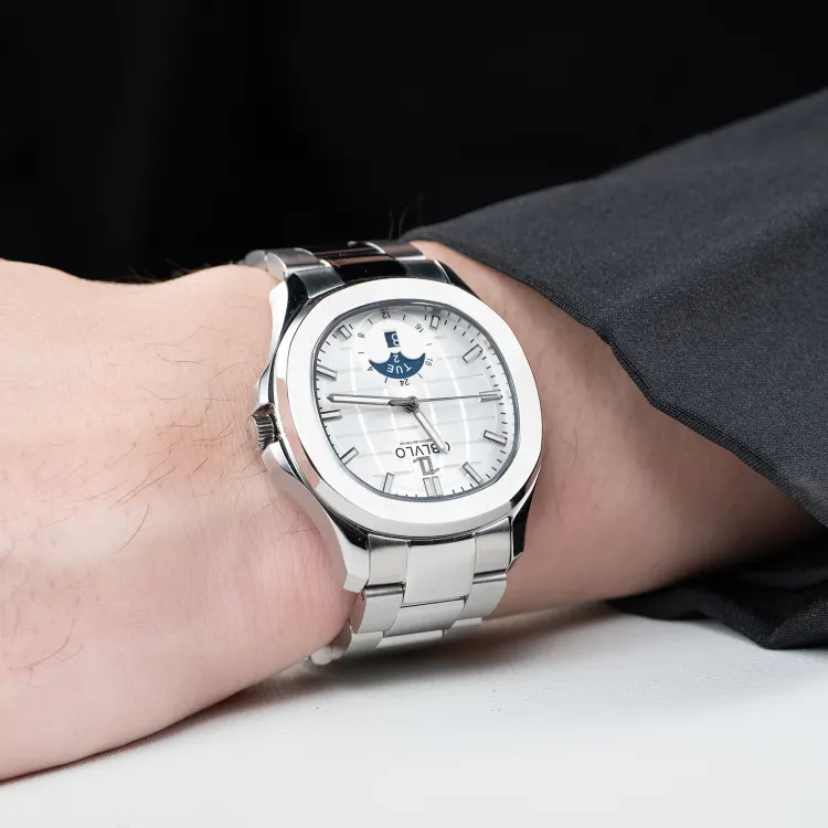 Серебряный корпус с белым циферблатом, серебряная полоска