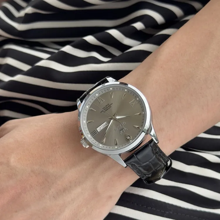 Черная кожа, настоящий серый [стальной браслет + коробка]