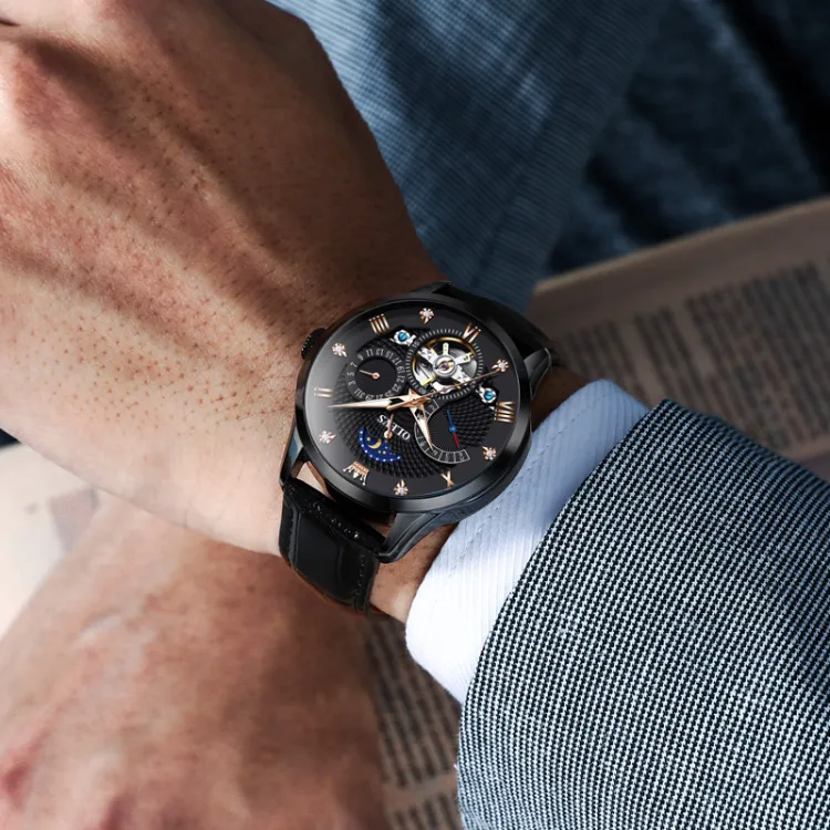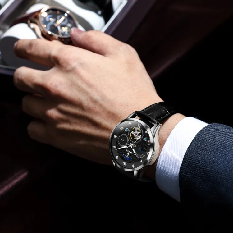 Комплект:Чёрный кожа с чёрным циферблатом [Роскошная коробка включена]