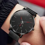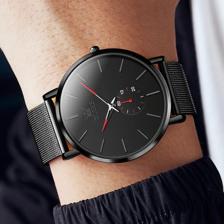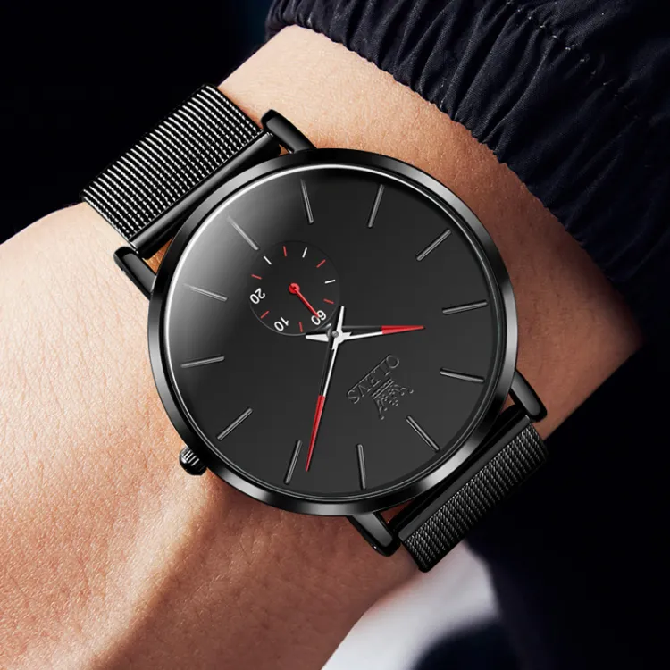 Комплект:Чёрный сетчатый корпус, чёрные часы, красный ремешок, мужские часы [подарочная коробка ограниченной серии]