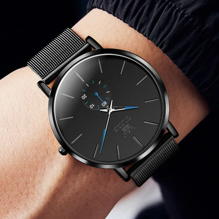 Черный сетчатый, черный корпус, синий циферблат, мужские часы [Коробка ограниченного издания]