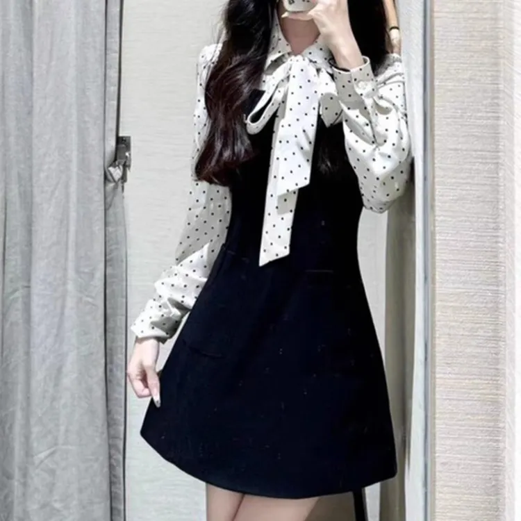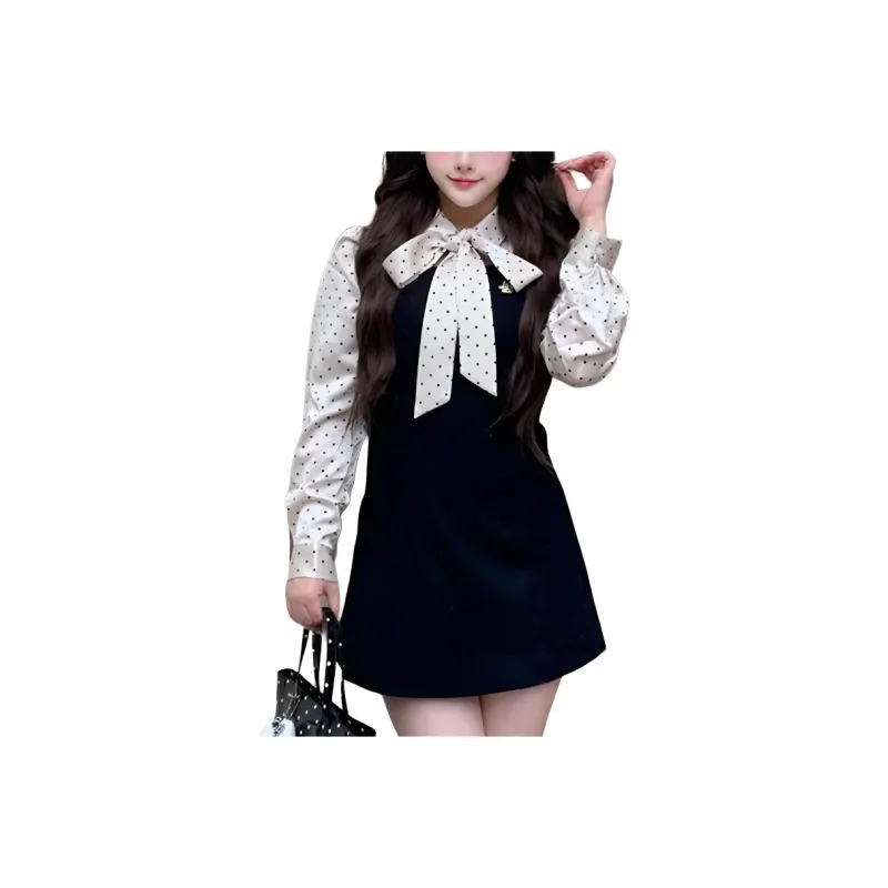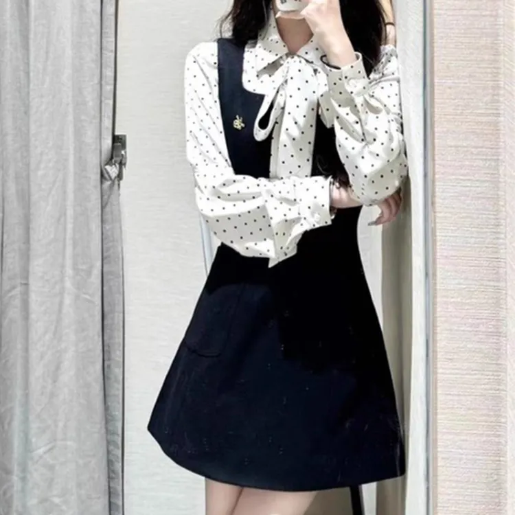 Рубашка в горошек + черная юбка на подтяжках