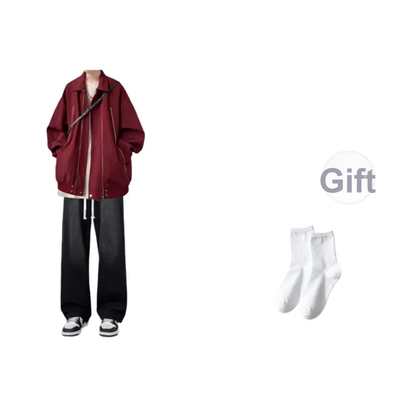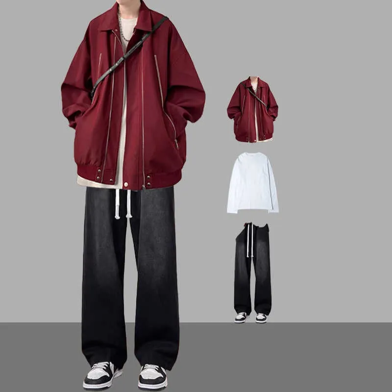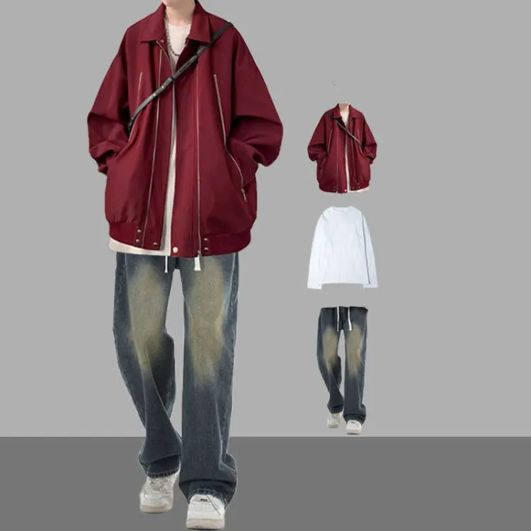 [Комплект из 3 предметов] Красная куртка + длинный белый топ + синие джинсы