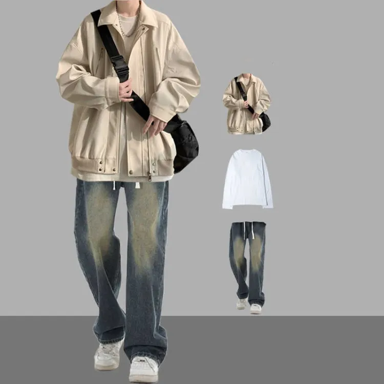 [Комплект из 3 предметов] Куртка (Абрикос) + Длинный Белый + Джинсы (Синий)